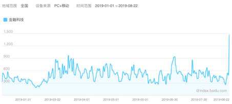 各项数据表明,2019年金融科技行业进入了低谷时期,而中国人民银行印发的《金融科技(FinTech)发展规划(2019-2021年)》,给金融科技行业打了一枚定心剂。根据百度搜索指数显示,在2019年8月22日,“金融科技”作为关键字,搜索次数剧增。