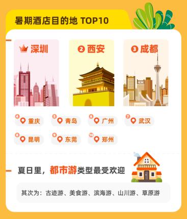 在暑期酒店目的地TOP10里,深圳、西安、成都同样位列三甲,由于暑期游家长带小朋友出玩居多,交通便利、服务良好的都市游成为首选,其次是古迹游、美食游和滨海游等。