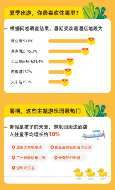 暑假是孩子的天堂,游乐园周边的酒店入住量平均增长了约10%。成都大熊猫基地、青岛海昌极地海洋公园、广州长隆欢乐世界三个景点最受家庭出游的喜爱,房间预定量呈现较高增长。