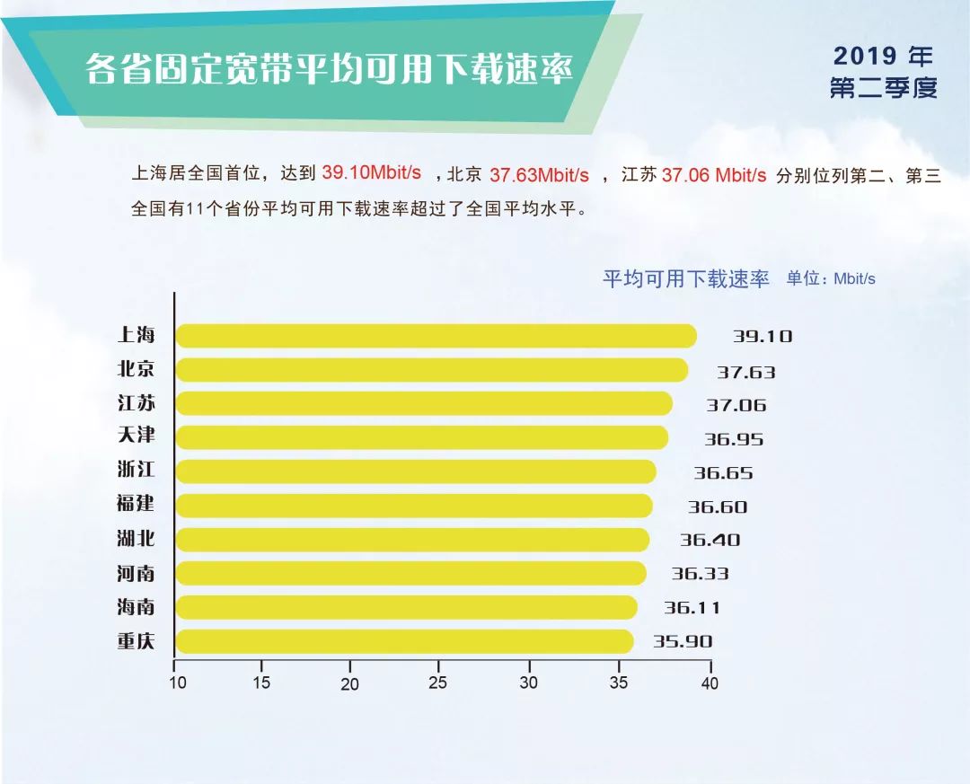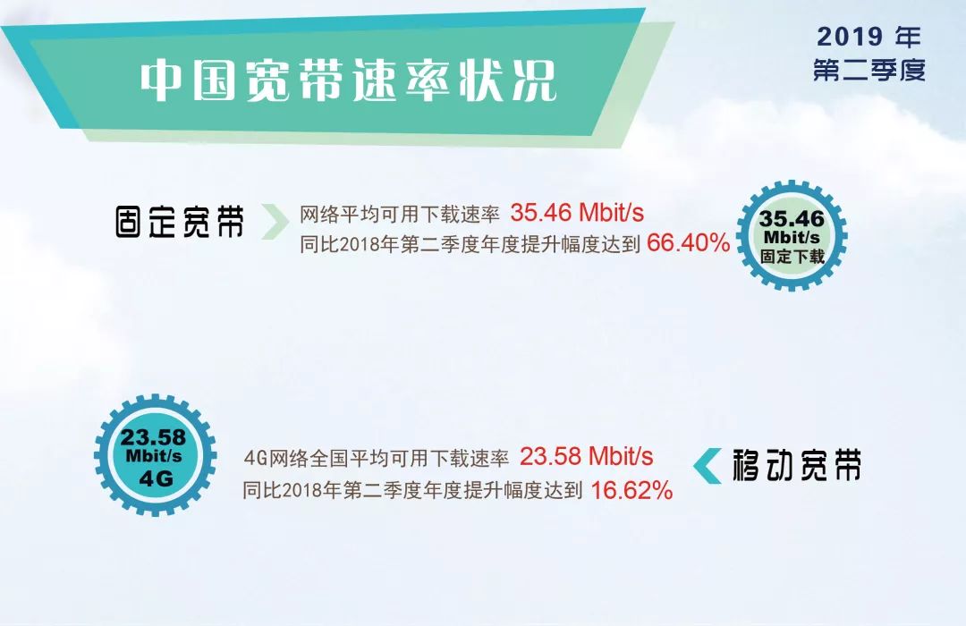 宽带发展联盟:2019年第二季度中国宽带速率状况 宽带发展联盟发布了2019年第二季度《中国宽带速率状况报告》(第24期)。报告显示,2019年第二季度我国固定宽带网络平均下载速率达到35.46Mbit/s,环比上季度提升了13.2%,同比去年同期提升了14.15 Mbit/s,年度提升幅度达到66.4%;我国移动宽带用户使用4G网络访问互联网时的平均下载速率达到23.58 Mbit/s,同比去年同期提升幅度也达到了16.6%。相关数据情况表明,我国固定宽带用户体验速率提升快速,移动宽带网络速率也在稳步提升,网络提速效果明显。 “提速降费”工作不仅能给企业和群众增便利添实惠,更能拉动有效投资和消费、带动扩大就业、发挥数字经济等新动能对经济社会发展的支撑引领作用。近年来,我国深入推进“提速降费工作”,光纤宽带和4G网络已经实现了对城乡地区的普遍覆盖,截至2019年第二季度,全国光纤宽带用户占比超过91%,4G用户占比达到77.6%,均位居全球先进行列,为宽带网速提升奠定了网络基础。而根据工信部、国资委发布的《两部门关于开展深入推进宽带网络提速降费支撑经济高质量发展2019专项行动的通知》,2019年还将通过开展千兆宽带入户示范、推动移动网络扩容升级、深化电信普遍服务试点、持续完善网络架构、增强互联网应用能力等一系列工作,进一步打通从用户终端到互联网应用端“端到端”宽带网络体验速率提升的各个环节,协同推动我国宽带网络体验速率不断提升。从宽带发展联盟对于我国宽带网络体验速率的持续监测也可以看出,我国网络提速取得了实实在在的成效。 本次报告还发布了全国各省(区、市)、主要城市和基础电信企业宽带网络相关速率的排名情况。固定宽带下载速率方面,上海、北京、江苏位列全国前三位,天津、浙江紧随其后。全国主要城市排行榜上,上海、北京、南京、杭州、武汉位居前五位;各基础电信企业中,中国电信最高达到35.65Mbit/s,其次是中国移动和中国联通。4G网络下载速率方面,上海、北京、天津、山东、江苏的4G网络用户下载速率排在全国省级行政区前五位;电信运营企业中,中国联通的4G网络用户下载速率最高。 此外,报告同期还发布了2019年第二季度我国固定宽带用户的网页平均首屏呈现时间为0.92秒,网络视频平均下载速率达到23.26Mbit/s,也均有一定幅度的提升。而宽带接入速率符合度持续保持在100%以上,符合《互联网接入服务规范》要求,变化相对平稳。 来源:宽带发展联盟 更多阅读:宽带发展联盟:2019年Q3我国固定宽带网络平均下载速率达到37.69Mbit/s宽带发展联盟:千兆宽带网络商业应用场景白皮书宽带发展联盟:2018年Q4我国固定宽带网络平均下载速率达到28.06Mbps宽带发展联盟:2019年第一季度我国固定宽带体验速率超过30Mbit/s宽带发展联盟:2017年Q3中国宽带速率状况报告宽带发展联盟:2015年Q3中国宽带速率状况报告宽带发展联盟:2015年Q2中国宽带速率状况报告日本电商乐天9亿美元收购语音通话应用ViberBCG:2025年职场AI研究报告软猎:2012.08月份APP Store数据监测报告TrendForce:苹果、索尼力推次世代显示技术,2018年Micro LED可望量产2024年Q3印度主要台式和笔记本电脑厂商出货量及同比(附原数据表) 2024上半年英国各用途新车市场注册量市场份额(附原数据表) 腾讯云发布企业级微服务中间件TSF 助企业构建亿级互联网应用架构Brand Perfect:67%的消费者表示过慢的网速是遗弃购物车的主要原因
