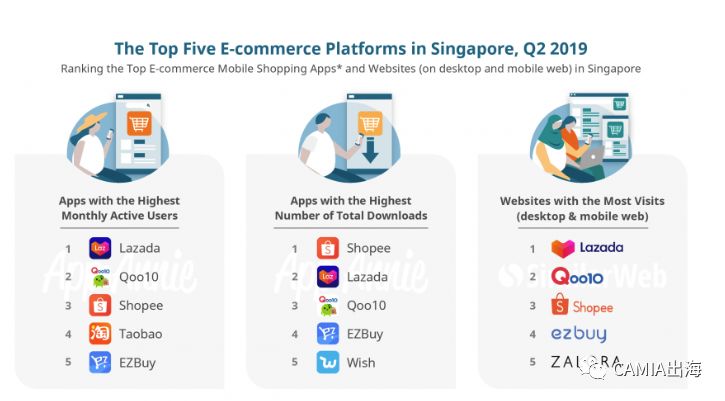 Lazada在2019年第2季度的MAU(移动应用程序)和总访问量(桌面和移动网络)都是最高的,在MAU的上一个季度也排名第一。