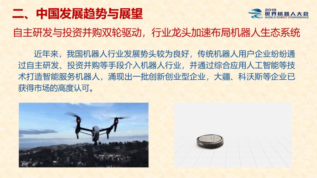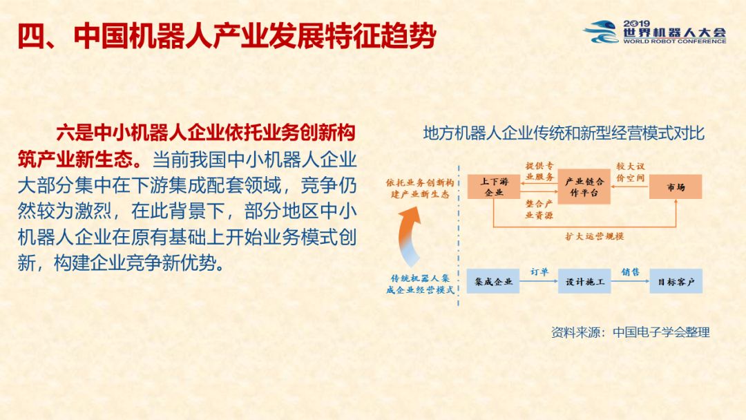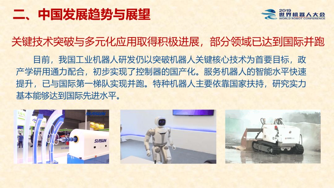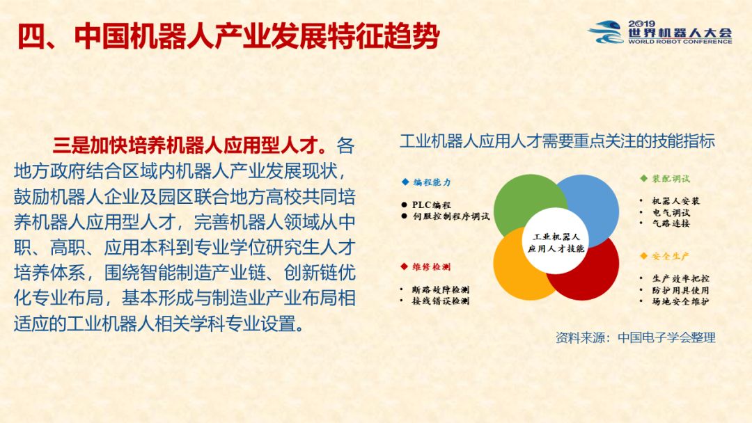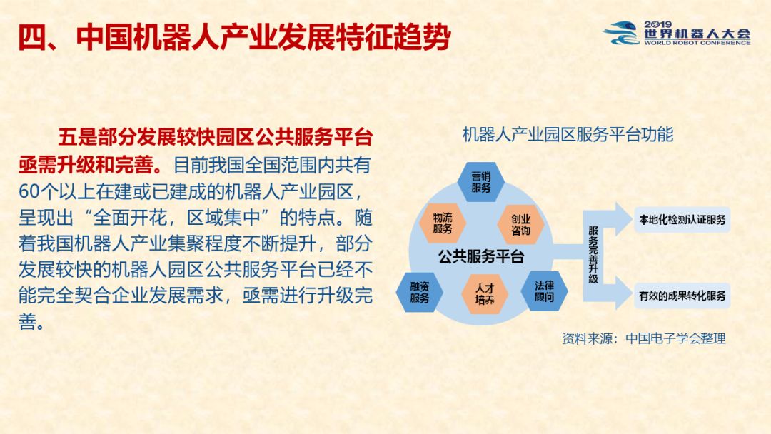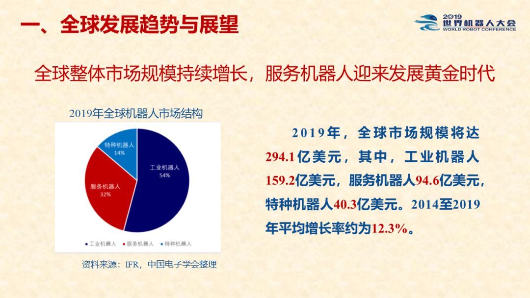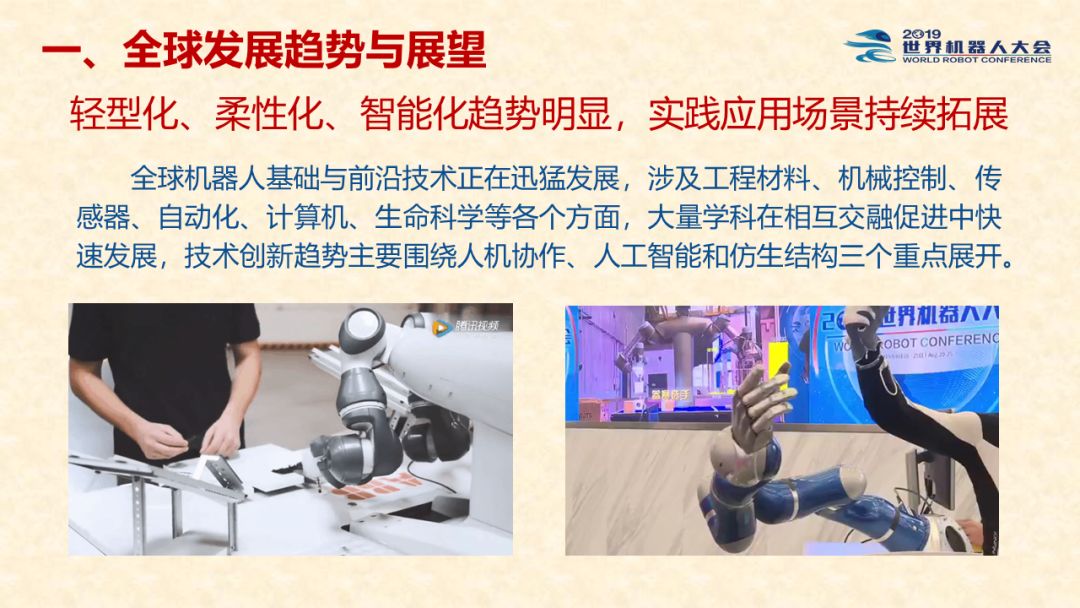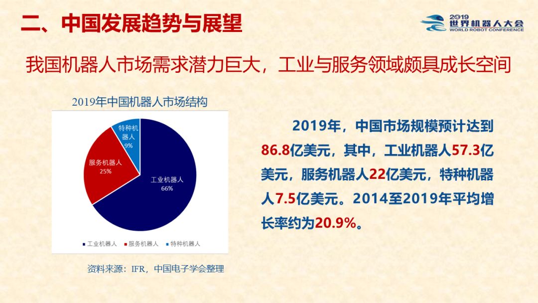中国机器人产业发展报告(2019) 《中国机器人产业发展报告(2019)》于2019世界机器人大会闭幕式上正式发布,该报告为工业和信息化部2019-2021年财政专项《我国机器人产业发展水平评估体系构建与智能机器人产业链增长点研究》的阶段性研究成果。 以下为发布PPT: 文章来源:世界机器人大会 更多阅读:中国电子学会:2017年中国机器人产业发展报告中国电子学会:2018年中国机器人产业发展报告CB Insights:中国、法国、印度和英国机器人企业越来越受投资者关注全球机器人产业规模越来越大 但谷歌把机器人弄糟了中国产机器人三年后将占据全球市场半壁江山调查显示34%工作比重可被机器人替代预计2017年全球服务机器人市场规模达到450亿美元极客爸爸:2017全球教育机器人行业研究报告国际机器人联合会:2017年每1万名制造业员工拥有74台机器人CondorCapital:2025年第二季度机器人顾问排名BackendBenchmarking:2020年第四季机器人报告IFR:2022年每1万名中国员工对应392台机器人中国企业综合调查报告显示:预计2025年机器人将取代中国4.7%的工人IFR:一文了解全球工业和服务机器人现状和趋势牛津经济研究所:机器人如何影响世界报告