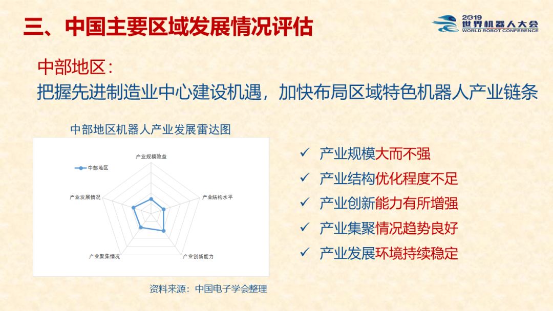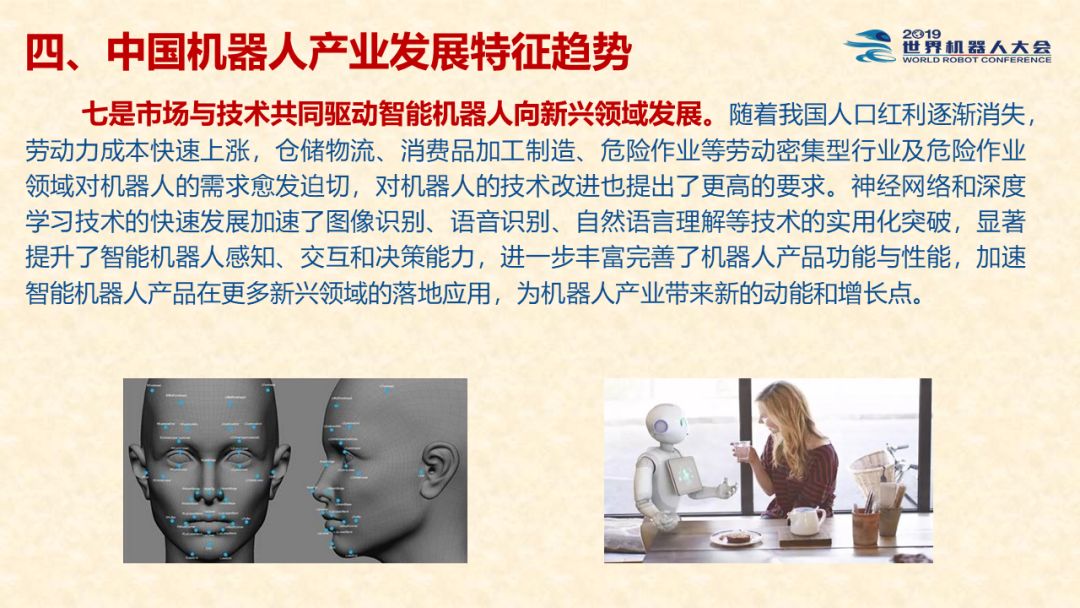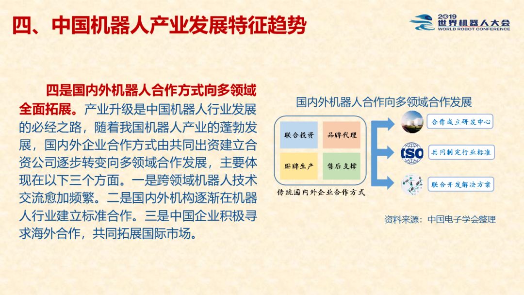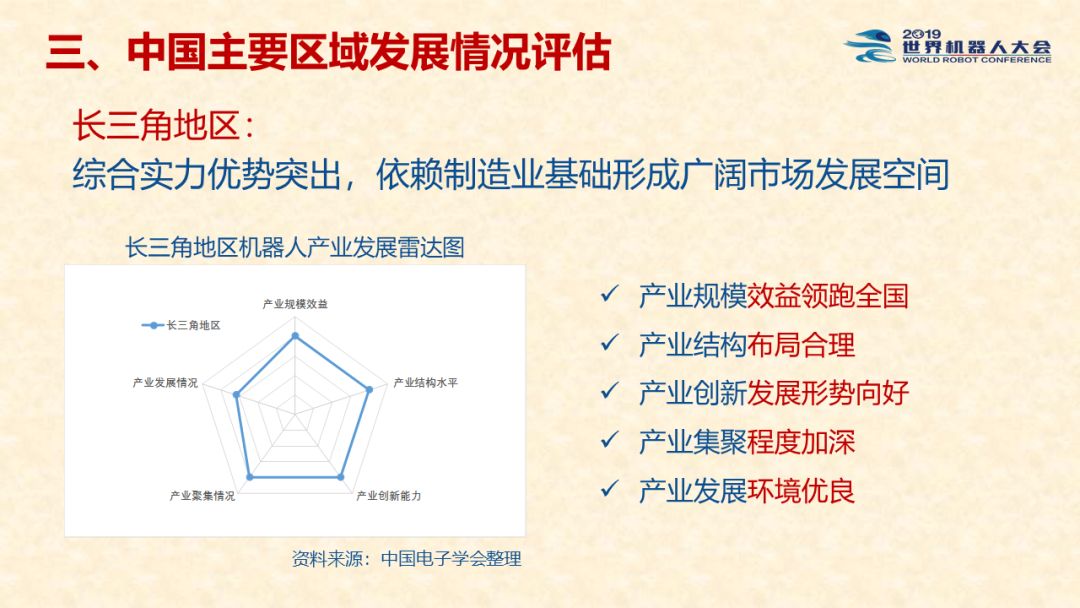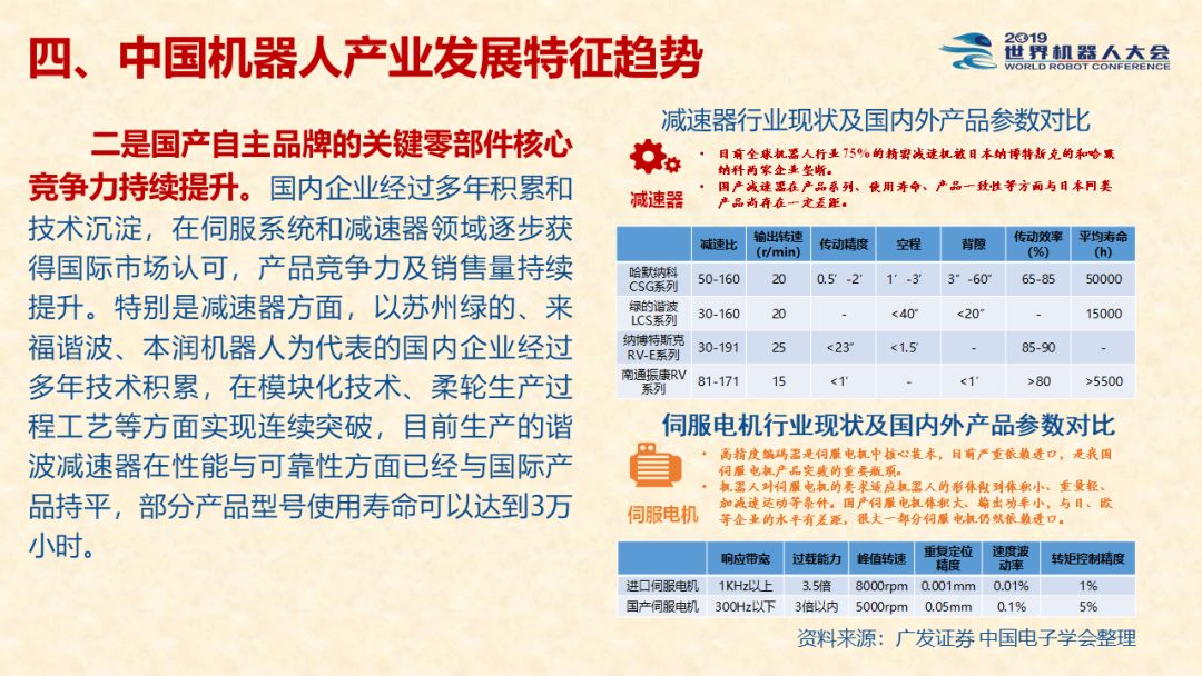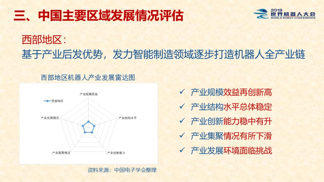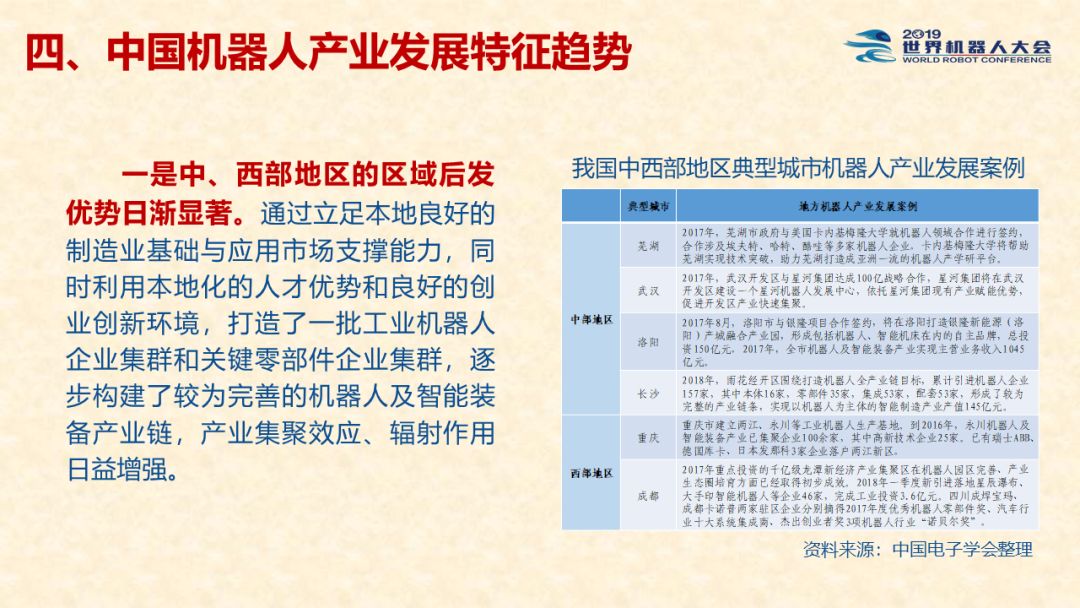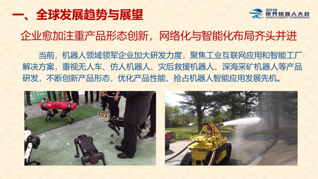 中国机器人产业发展报告(2019) 《中国机器人产业发展报告(2019)》于2019世界机器人大会闭幕式上正式发布,该报告为工业和信息化部2019-2021年财政专项《我国机器人产业发展水平评估体系构建与智能机器人产业链增长点研究》的阶段性研究成果。 以下为发布PPT: 文章来源:世界机器人大会 更多阅读:中国电子学会:2017年中国机器人产业发展报告中国电子学会:2018年中国机器人产业发展报告CB Insights:中国、法国、印度和英国机器人企业越来越受投资者关注全球机器人产业规模越来越大 但谷歌把机器人弄糟了中国产机器人三年后将占据全球市场半壁江山调查显示34%工作比重可被机器人替代预计2017年全球服务机器人市场规模达到450亿美元极客爸爸:2017全球教育机器人行业研究报告国际机器人联合会:2017年每1万名制造业员工拥有74台机器人CondorCapital:2025年第二季度机器人顾问排名BackendBenchmarking:2020年第四季机器人报告IFR:2022年每1万名中国员工对应392台机器人中国企业综合调查报告显示:预计2025年机器人将取代中国4.7%的工人IFR:一文了解全球工业和服务机器人现状和趋势牛津经济研究所:机器人如何影响世界报告