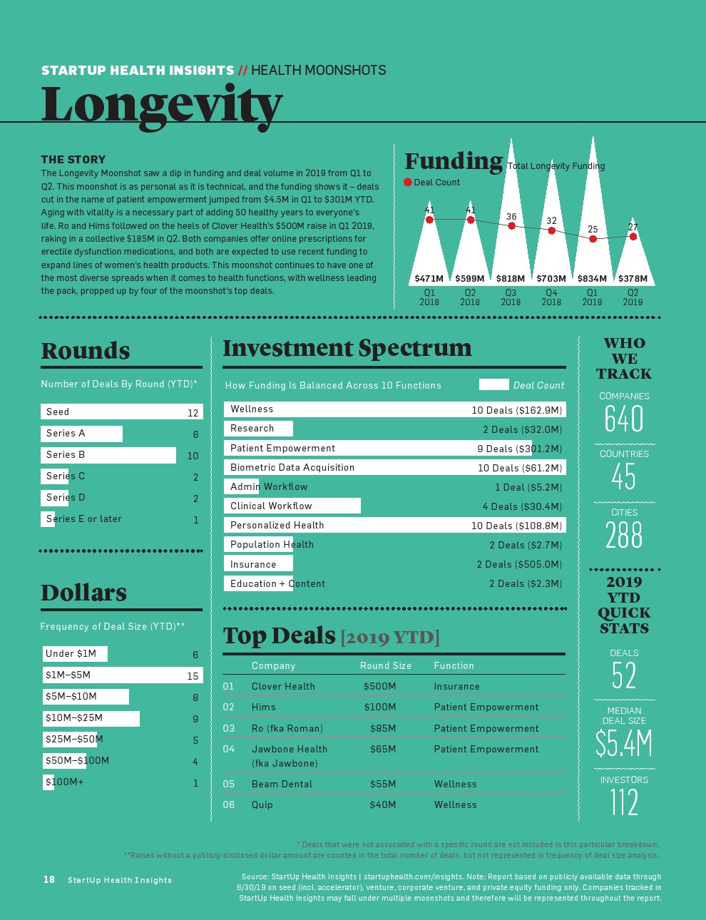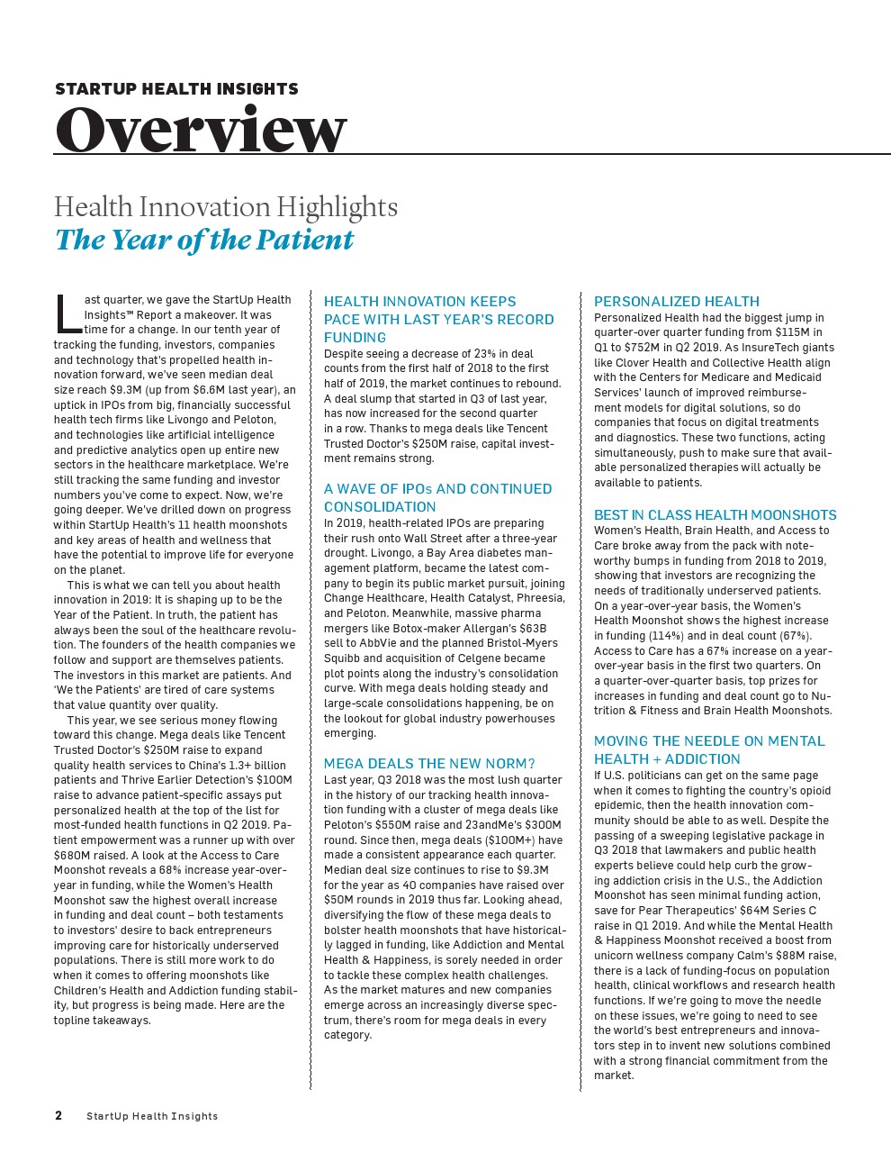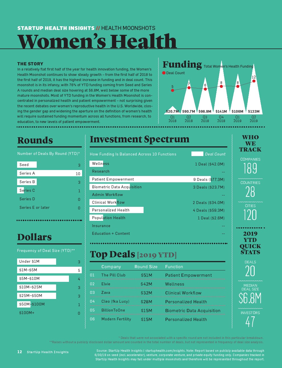 从2018年到2019年,女性健康、大脑健康和女性护理等投资脱颖而出。女性健康卫生领域投资额增长114%,交易数量增长57%。