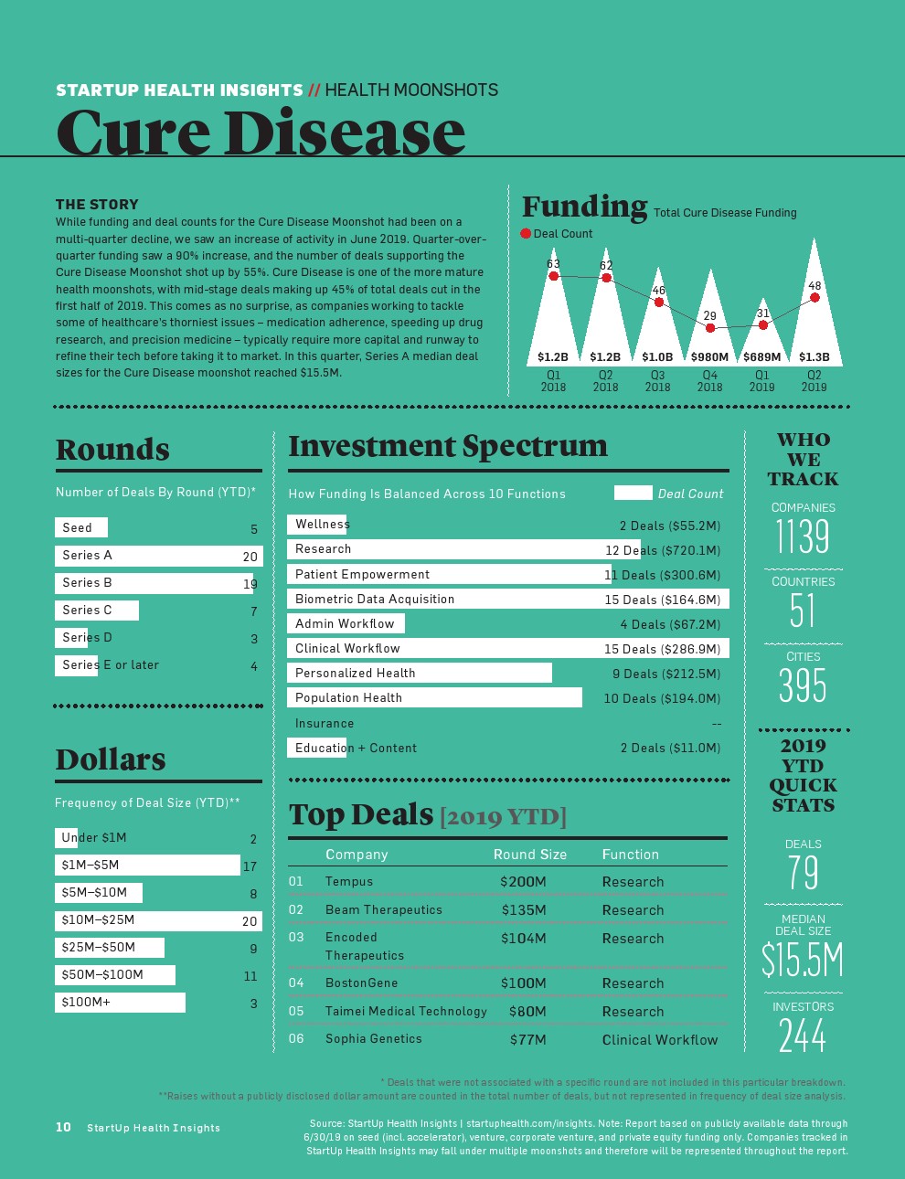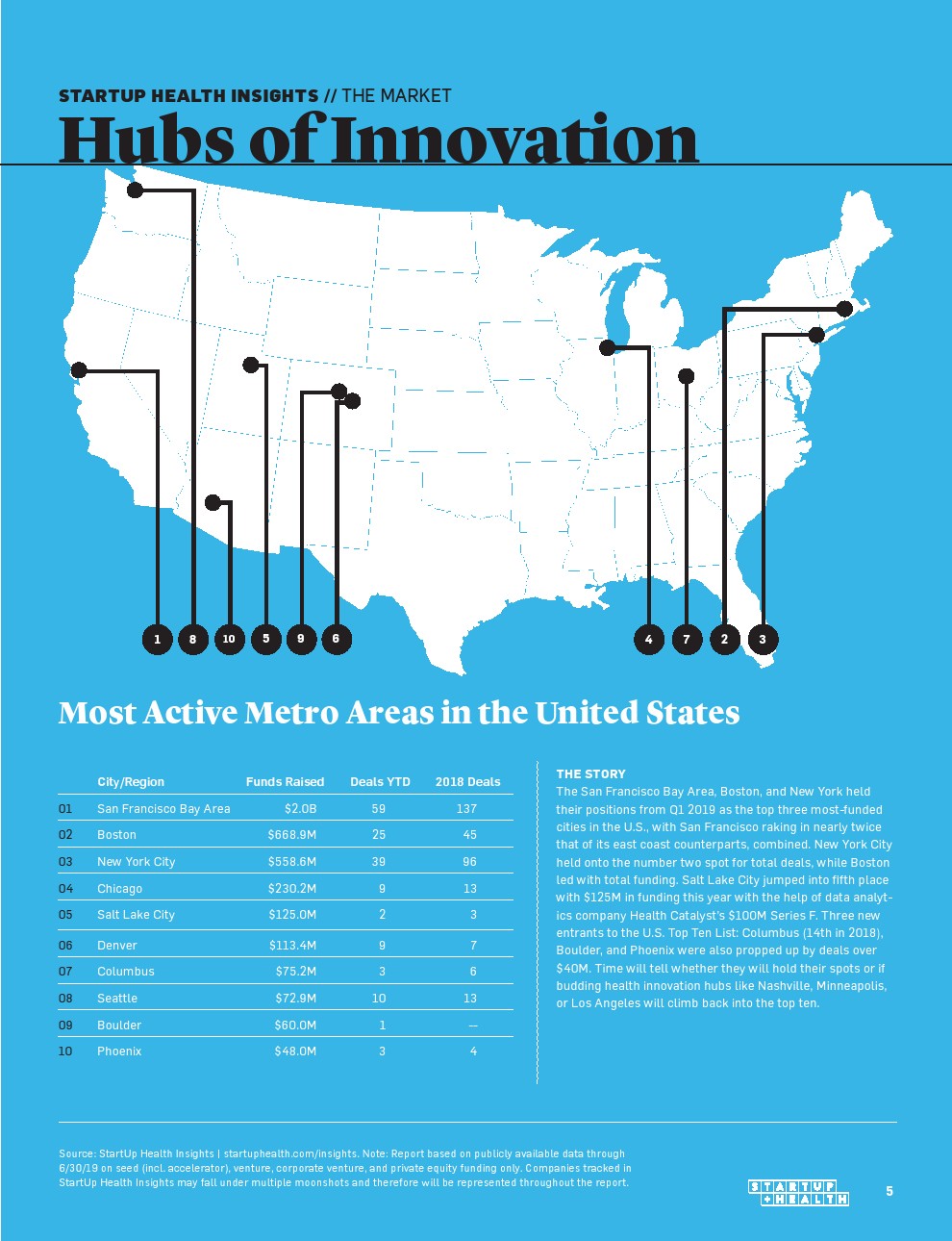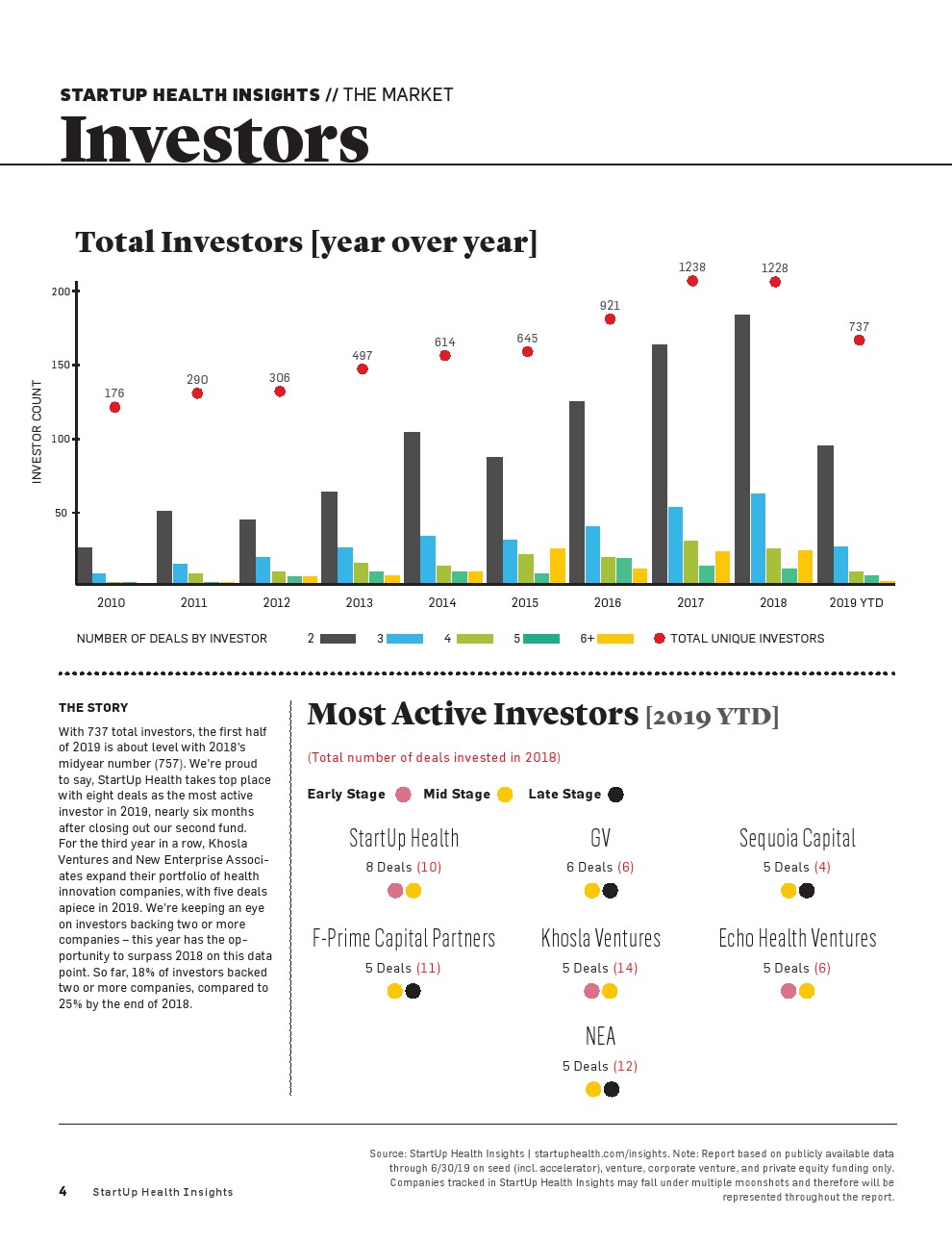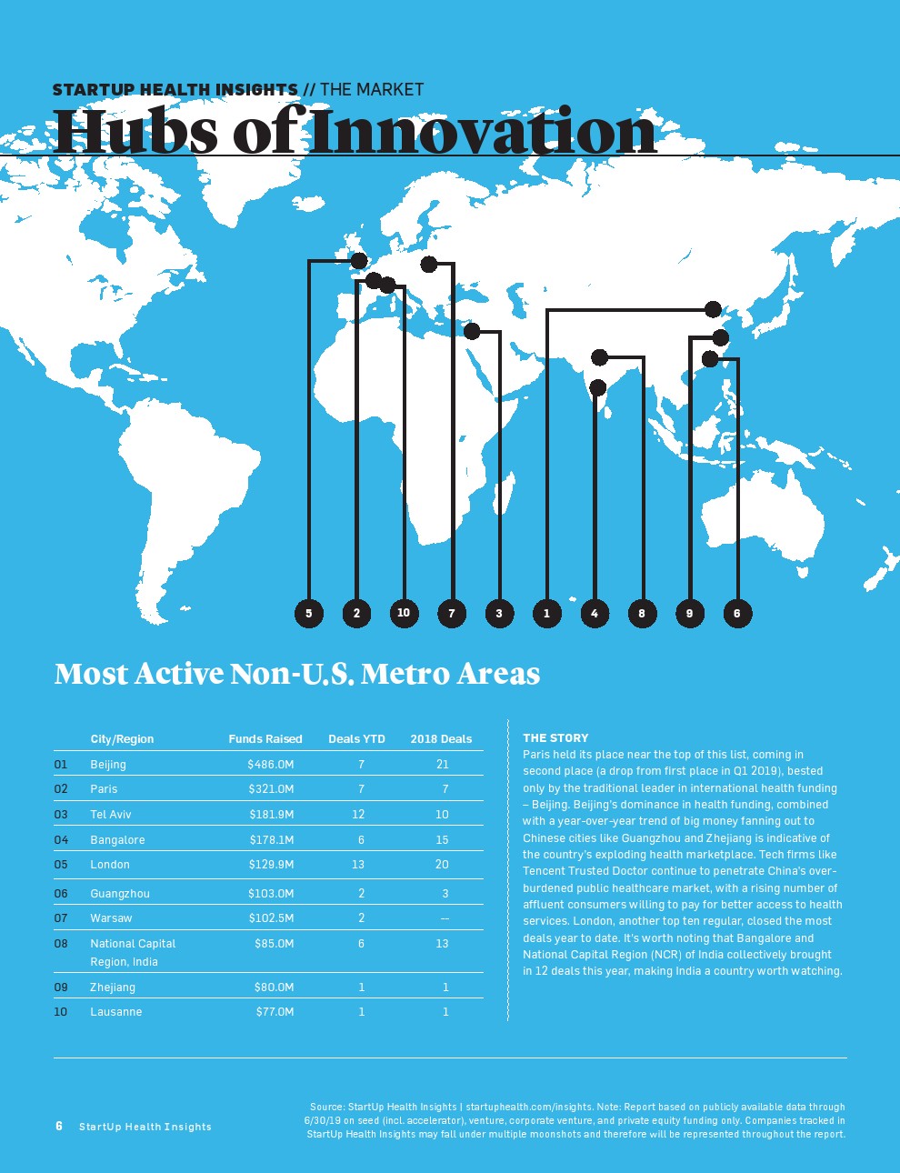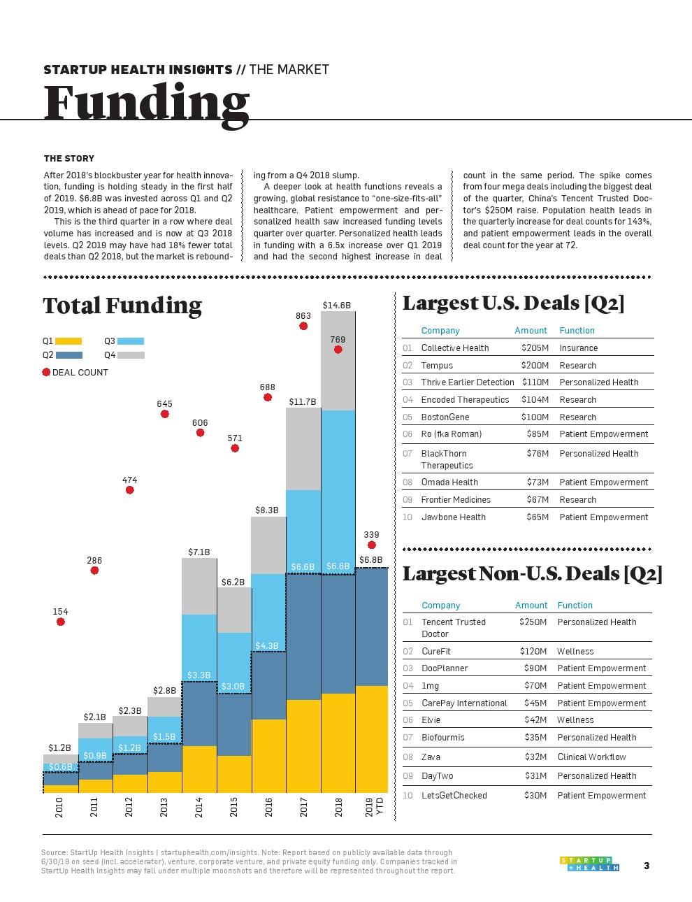 尽管从2018年上半年到2019年上半年,健康创新投资交易量减少了23%,但市场继续反弹。由于腾讯企鹅医生(2.5亿美元)等大规模交易,投资额保持强劲。