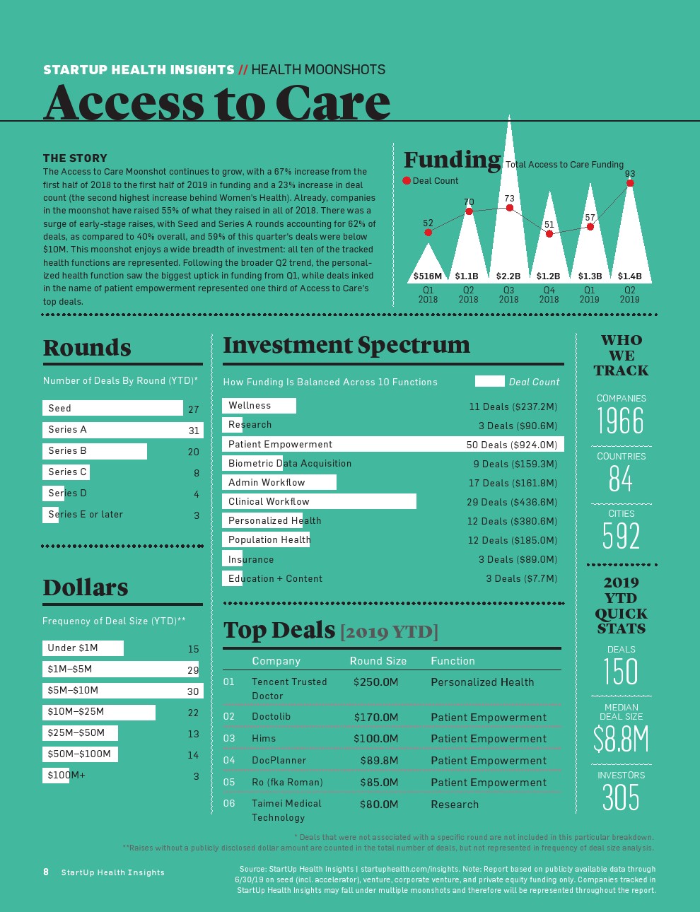 患者是医疗革命的灵魂,医疗保健市场的投资的推动者也是患者。例如,腾讯企鹅医生融资2.5亿美元后将为中国13亿人提供高质量的医疗服务。医疗科技公司Thrive Earlier Detection获得1亿美元融资,用于推进针对特定患者的检测。这使得个性化保健成为2019年第二季度最受欢迎的健康医疗分支领域,投资额超过6.8亿美元。