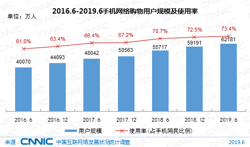 截至2019年6月,我国网络购物用户规模达6.39亿,较2018年底增长2871万,占网民整体的74.8%;手机网络购物用户规模达6.22亿,较2018年底增长2989万,占手机网民的73.4%。