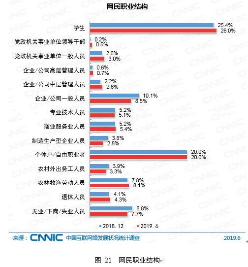 截至2019年6月,在我国网民群体中,学生最多,占比为26.0%;其次是个体户/自由职业者,占比为20.0%;企业/公司的管理人员和一般人员占比共计11.8%。