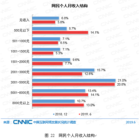 截至2019年6月,无收入及月收入 在500元以下的网民群体占比为19.9%;月收入在2001-5000元的网民群体合计占比超过三分之一,为33.4%;月收入在5000元以上的网民群体占比为27.2%。