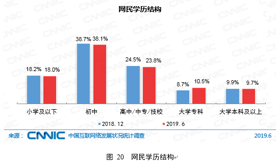 截至2019年6月,初中、高中/中专/技校学历的网民群体占比分别为38.1%、23.8%;受过大学专科、大学本科及以上教育的网民群体占比分别为10.5%、9.7%。