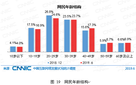 截至2019年6月,10-39岁网民群体占网民整体的65.1%,其中20-29岁网民群体占比最高,达24.6%;40-49岁网民群体占比由2018年底的15.6%提升至17.3%;50岁及以上网民群体占比由2018年底的12.5%提升至13.6%,互联网持续向中高龄人群渗透。