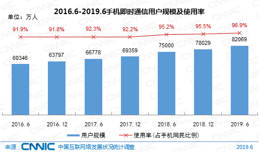 截至2019年6月,我国即时通信用户规模达8.25亿,较2018年底增长3298万,占网民整体的96.5%;手机即时通信用户规模达8.21亿,较2018年底增长4040万,占手机网民的96.9%。