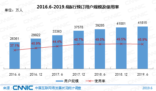 截至2019年6月,我国在线旅行预订用户规模达4.18亿,较2018年底增长814万,占网民整体的48.9%。