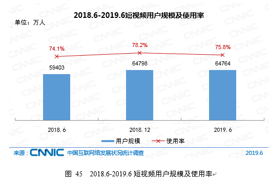 截至2019年6月,我国网络视频用户规模达7.59亿,较2018年底增长3391万,占网民整体的88.8%。其中长视频用户规模为6.39亿,占网民整体的74.7%;短视频用户规模为6.48亿,占网民整体的75.8%。