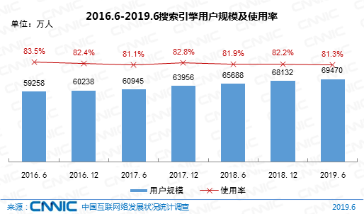 截至2019年6月,我国搜索引擎用户规模达6.95亿,较2018年底增长1338万,占网民整体的81.3%;手机搜索引擎用户规模达6.62亿,较2018年底增长806万,占手机网民的78.2%。