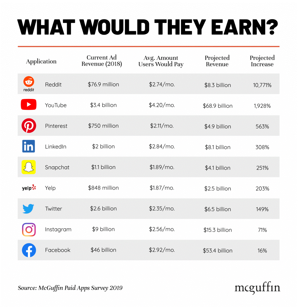 根据这样的假设,McGuffincg预计所有九家受访公司将在假设的有偿未来获得更多收入。这包括Facebook,尽管表示不愿意为任何内容付费的用户比例最高。