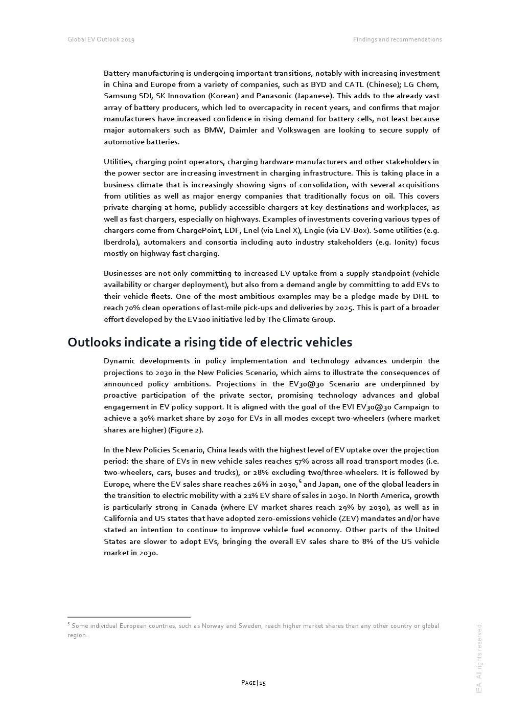 私营部门对公共政策信号的反应证实了运输电气化的不断升级的势头。特别是,汽车制造商对于电动汽车和公共汽车市场的勃勃雄心。电池制造业也正在经历重要转变,包括扩大生产的重大投资。公用事业、充电点运营商、充电硬件制造商和其他电力行业利益相关者也在加大对充电基础设施的投资。