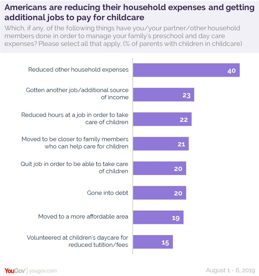 YouGov最近与纽约时报合作,向父母询问学前班和日托对他们生活的财务影响。调查发现,大多数(59%)有上幼儿园或托儿所的孩子的父母表示,支付托儿费是一项重大的经济压力。
