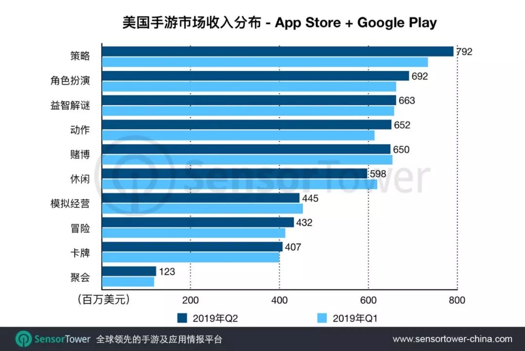 Q2美国手游市场收入冠军依然是上市近7年的King《糖果粉碎传奇》,在 App Store 和 Google Play 总收入达到1.46亿美元,虽环比下滑13%,但仍是排名第2的Supercell《部落冲突》同期收入的1.5倍,美国女性手游玩家的消费力以及对游戏的忠诚度可见一斑。