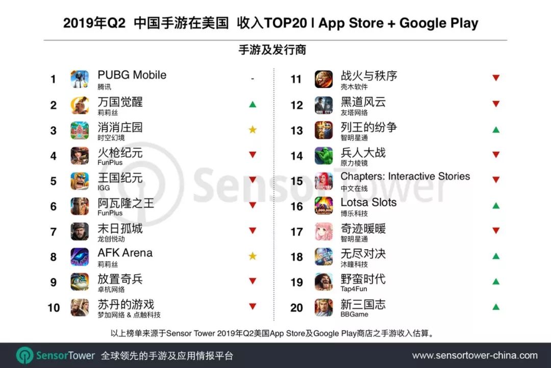 收入榜方面,腾讯《PUBG MOBILE》蝉联冠军,Q2吸金近7200万美元,莉莉丝《万国觉醒》和《AFK Arena》分列榜单第2和第8名。涨幅较高的还有智明星通《Clash of Kings》,沐瞳《无尽对决》,Tap4Fun《野蛮时代》和BBGame《新三国志》,季度环比增长依次为17%,26%,29%和98%。