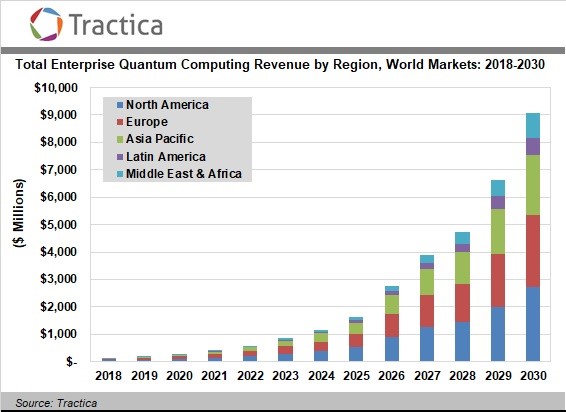 Tractica预测,到2030年,企业量子计算市场的总收入将达到91亿美元,高于2018年的1.116亿美元。