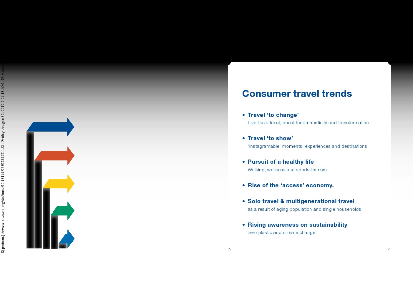 这种增长更需要确保有效的目的地管理,最大限度地减少旅游业的任何不利影响。以可持续的方式管理旅游业以造福所有人,这比以往任何时候都更加重要。旅游业需要增加价值而不仅仅是数量。预计数字化、创新和社会变革将继续影响旅游业。目的地和公司都需要适应这些以保持竞争力,同时将旅游业作为实现可持续发展的目标和为所有人建设更美好未来的手段。