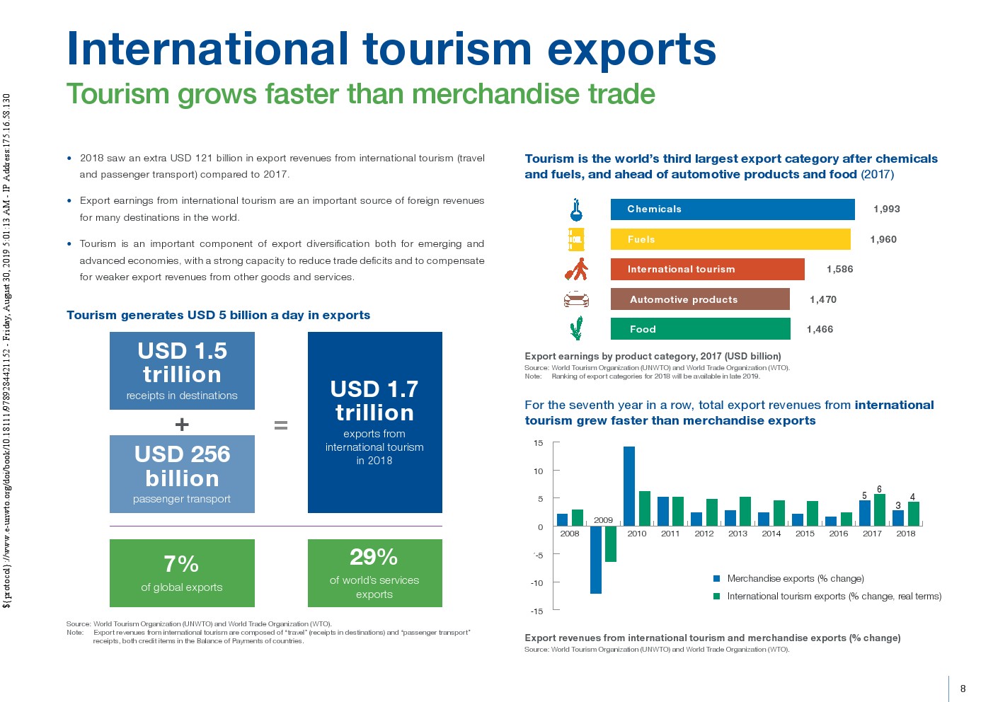 国际旅游人数和收入的增长继续超过世界经济,新兴和发达经济体都受益于旅游收入的增长。旅游出口增长连续第七年快于商品出口,减少了许多国家的贸易逆差。