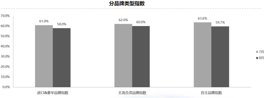 从分品牌类型指数看:2019年8月进口&豪华品牌指数、合资品牌指数、自主品牌指数较上月均有下降。
