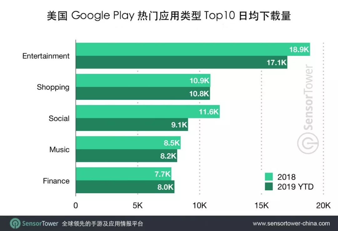 在美区 Google Play 上,以 Netflix,Hulu 和 Bitmoji 为首的娱乐应用是除手游以外最受欢迎的类别。这一类别进入 Top10 的门槛是日均下载量达到1.71万次。排名第二是购物类应用,Top10 准入门槛为日均下载量达到1.08万次。其次为社交,音乐和金融类应用。