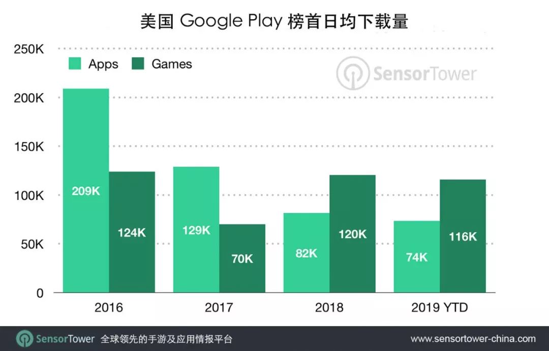 总的来说,随着近年来美国移动市场渗透率的提高,非游戏类应用不像以前,由几大热门应用垄断赛道,这意味着留给其它应用的机会更多。尤其是 Google Play 上,榜首下载量较2016年下降了71%。而手游赛道恰好相反,超休闲游戏的兴起大幅提高了登顶下载榜榜首的门槛。我们将持续观察2019年下半年的行业趋势。