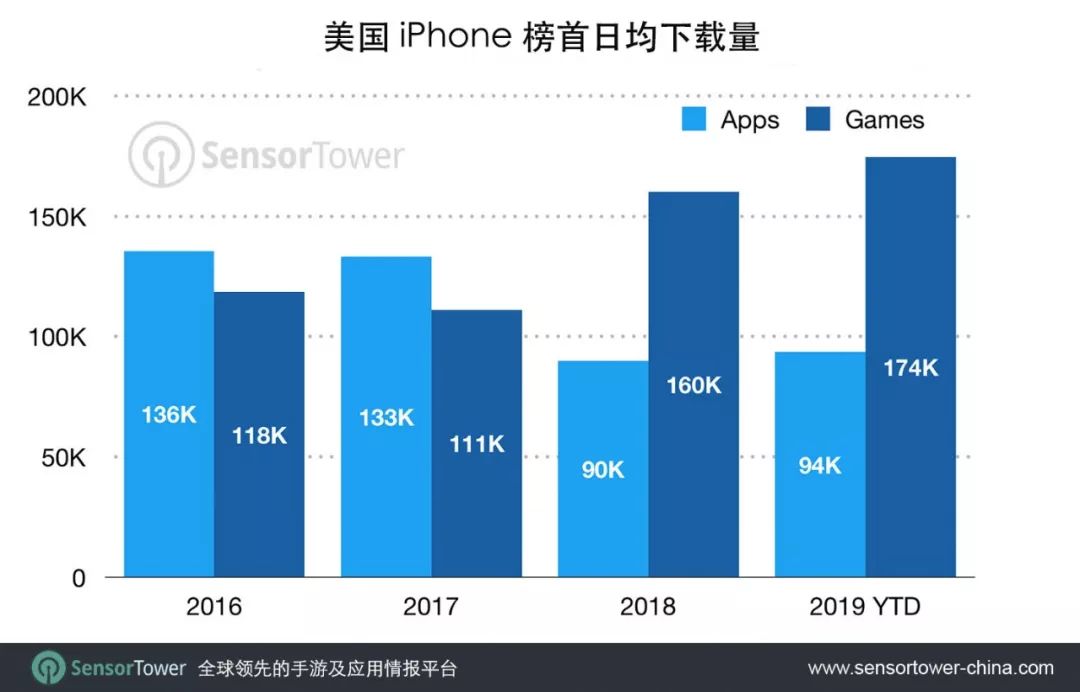Sensor Tower 商店情报数据显示,平均而言,现在要登上美区App Store手游下载榜榜首,一天大约要维持17.4万下载量,比非游戏应用下载榜榜首9.4万下载量高出85%。同时,非移动应用榜首下载量均值,较2016年下滑了31%。