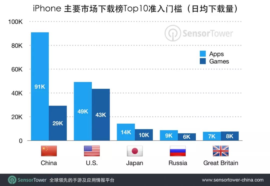 2019年,在中国 App Store 上,非游戏类应用跻身下载榜 Top10 需要达到日均9.1万次下载。远高于美国 (4.9万次) 和日本市场 (1.4万次)。手游方面,美国市场 Top10 准入门槛最高,日均下载量需达到4.3万次。其次为中国,日本和英国,分别为2.9万次,1万次和8000次。
