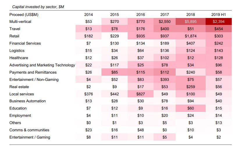 虽然在线零售和本地服务以及多垂直公司仍然是资金最充足的行业,但其它领域如金融服务业和旅游业正吸引着越来越多的关注。由于 2019 年上半年物流和医疗行业获得了更多融资,也正成为资金最充足的行业之一。从交易数量上看,我们还发现投资者对房地产、商业自动化、广告和营销技术等其它领域的兴趣正在升温。