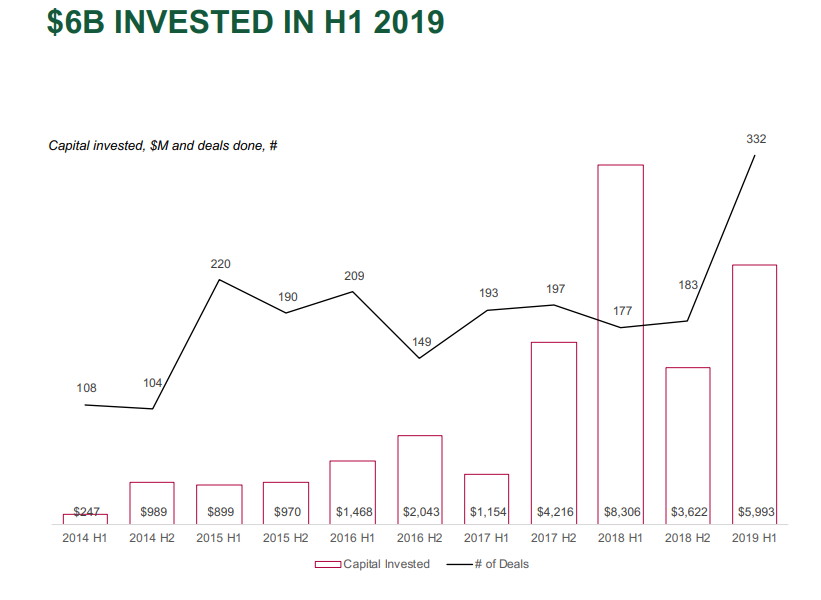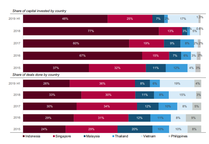 2019 年上半年有超过 300 家公司得到投资,创历史新高。与 2018 年上半年相比,尽管有所减少,但 2019 年东南亚的科技投资似乎更加多元化。