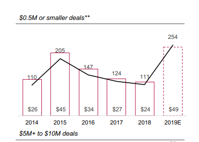 小型的融资(低于 50 万美元)在 2019 年上半年出现激增,这部分增长是由 Antler、SKALA 和 Accelerating Asia 等公司孵化推动的。