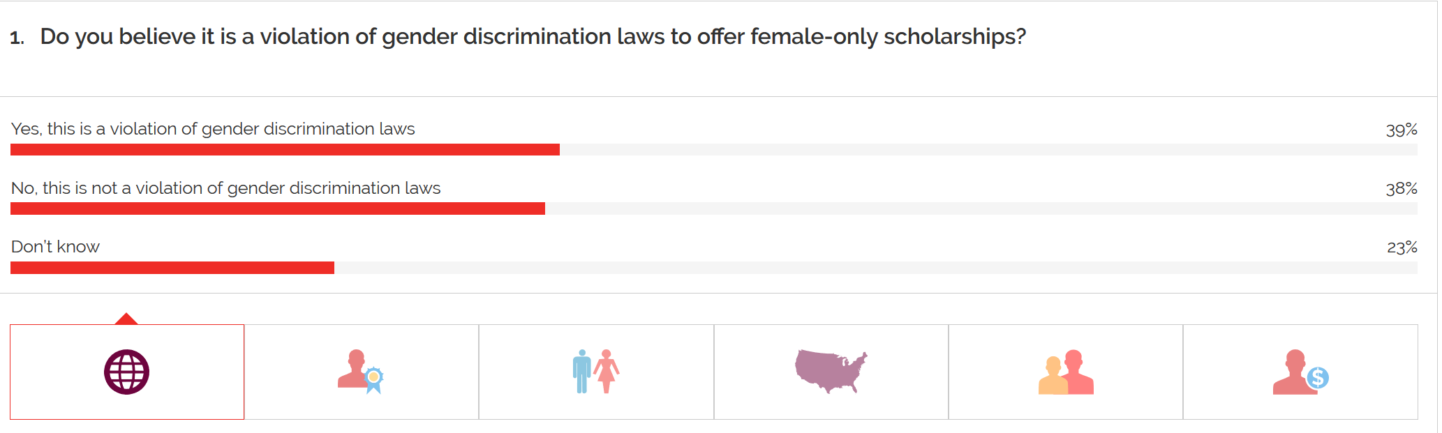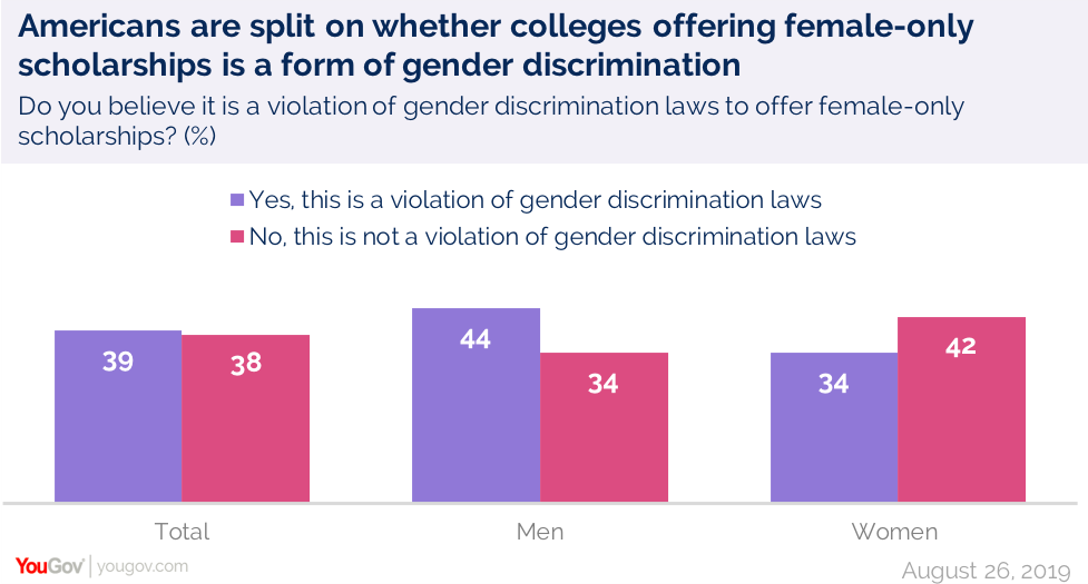 YouGov最近的研究发现,美国人对此的态度模棱两可,39%的受访者认为只为女性提供奖学金违反了性别歧视法;38%的受访者认为没有。