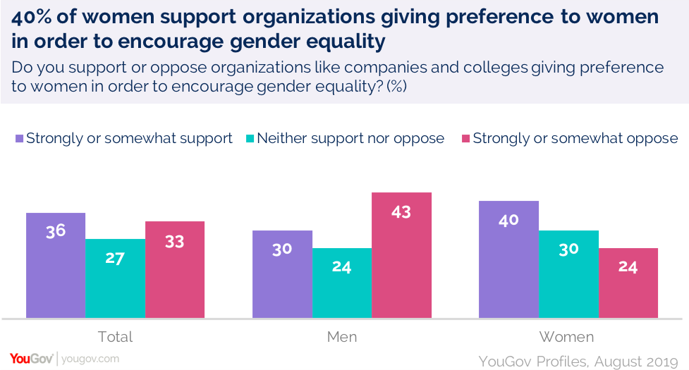 YouGov的另外一项研究发现,当美国人更普遍地被问及提升女性的举措时,也会出现类似的性别差异。
