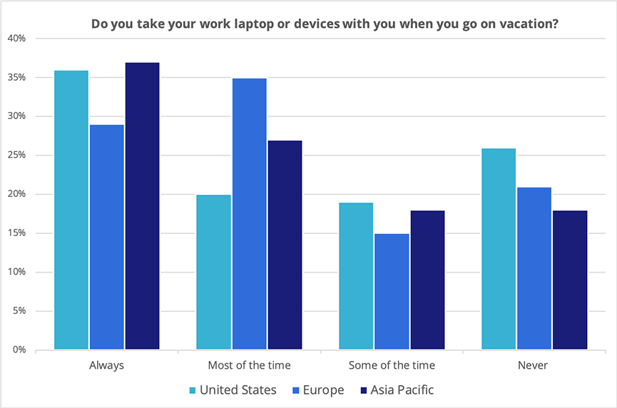1/3的美国(36%)和亚太地区(37%)受访者表示,他们总是在度假时带着工作设备。在APAC,印度人始终携带工作设备的比例最高,为62%;紧随其后的是中国香港(60%)、中国大陆(36%)、新西兰(33%)和日本(30%)。澳大利亚人(28%)在度假时更可能平衡工作和生活,这一点与欧洲更相似。