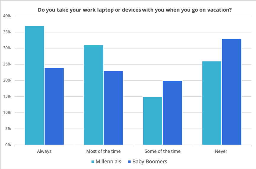 千禧一代代表了第一代数字原住民,因此37%的年轻员工总是带着雇主发放的设备,即使是度假时;婴儿潮一代只有24%这么做。相反,33%的婴儿潮一代从不随身携带工作设备,而千禧一代中只有18%这样做。