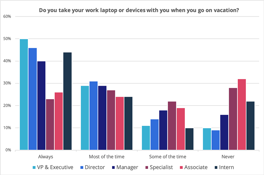 50%的副总裁和高层管理人员更有可能在度假时带上他们的工作设备。44%的实习生也有相同的习惯。