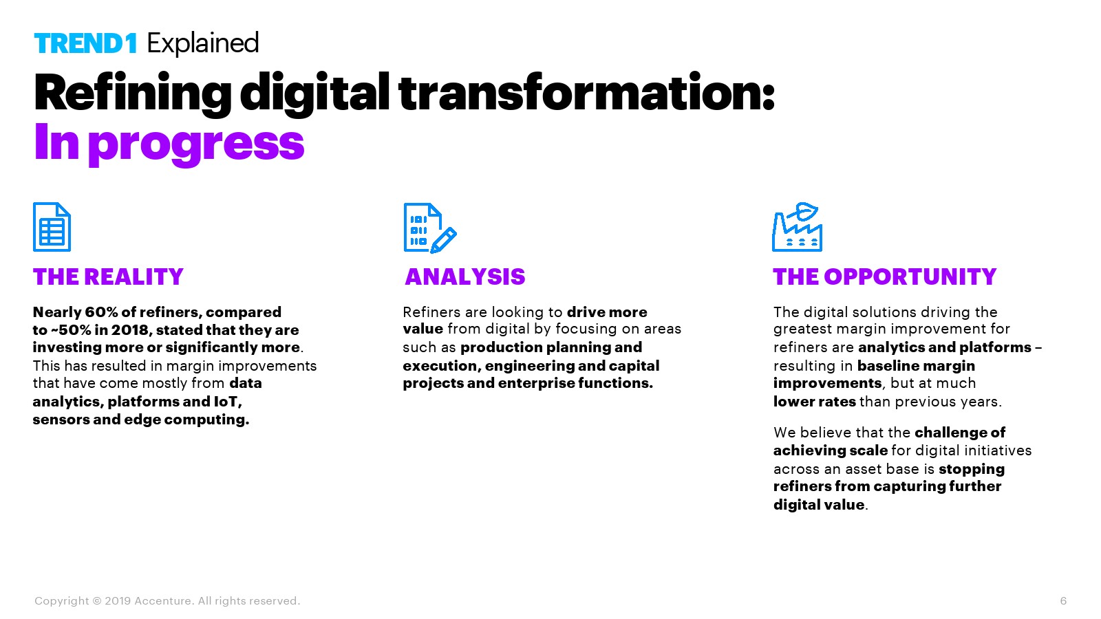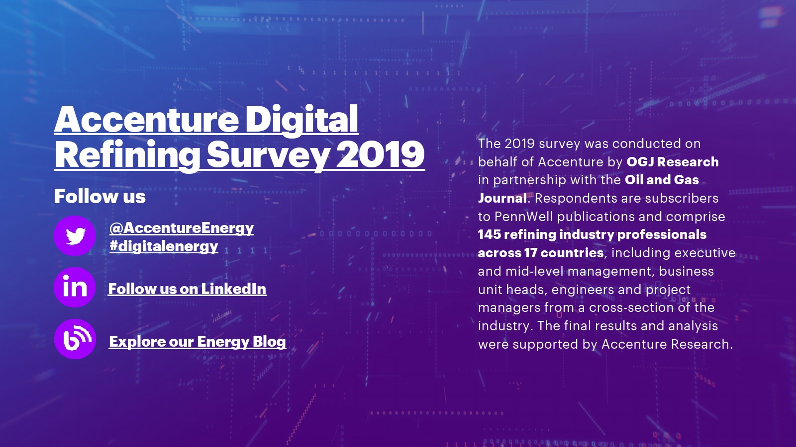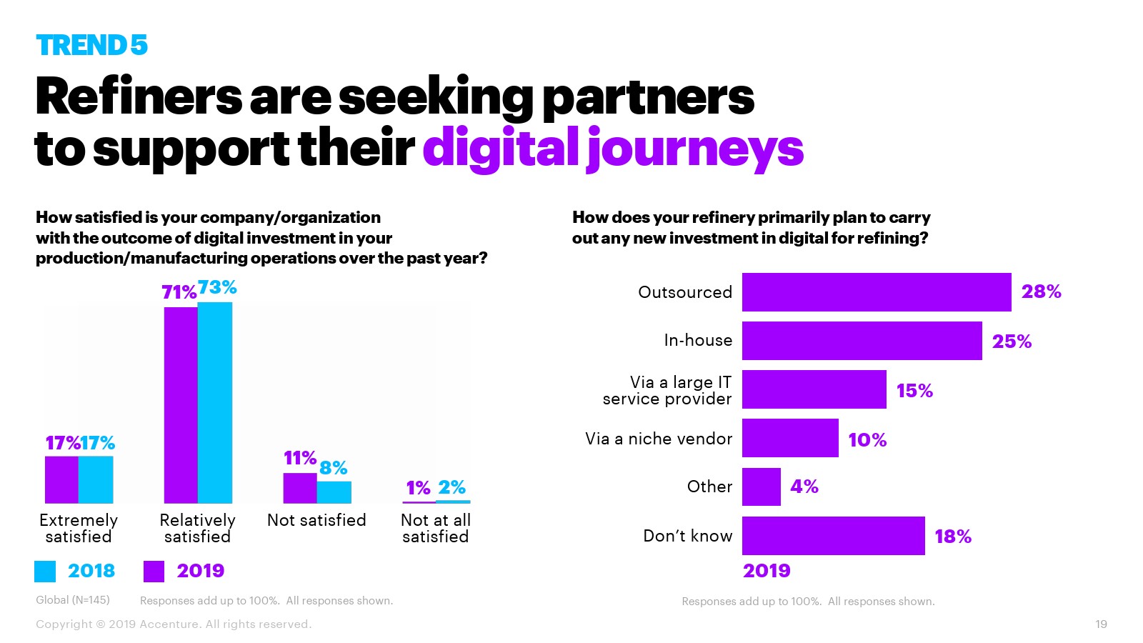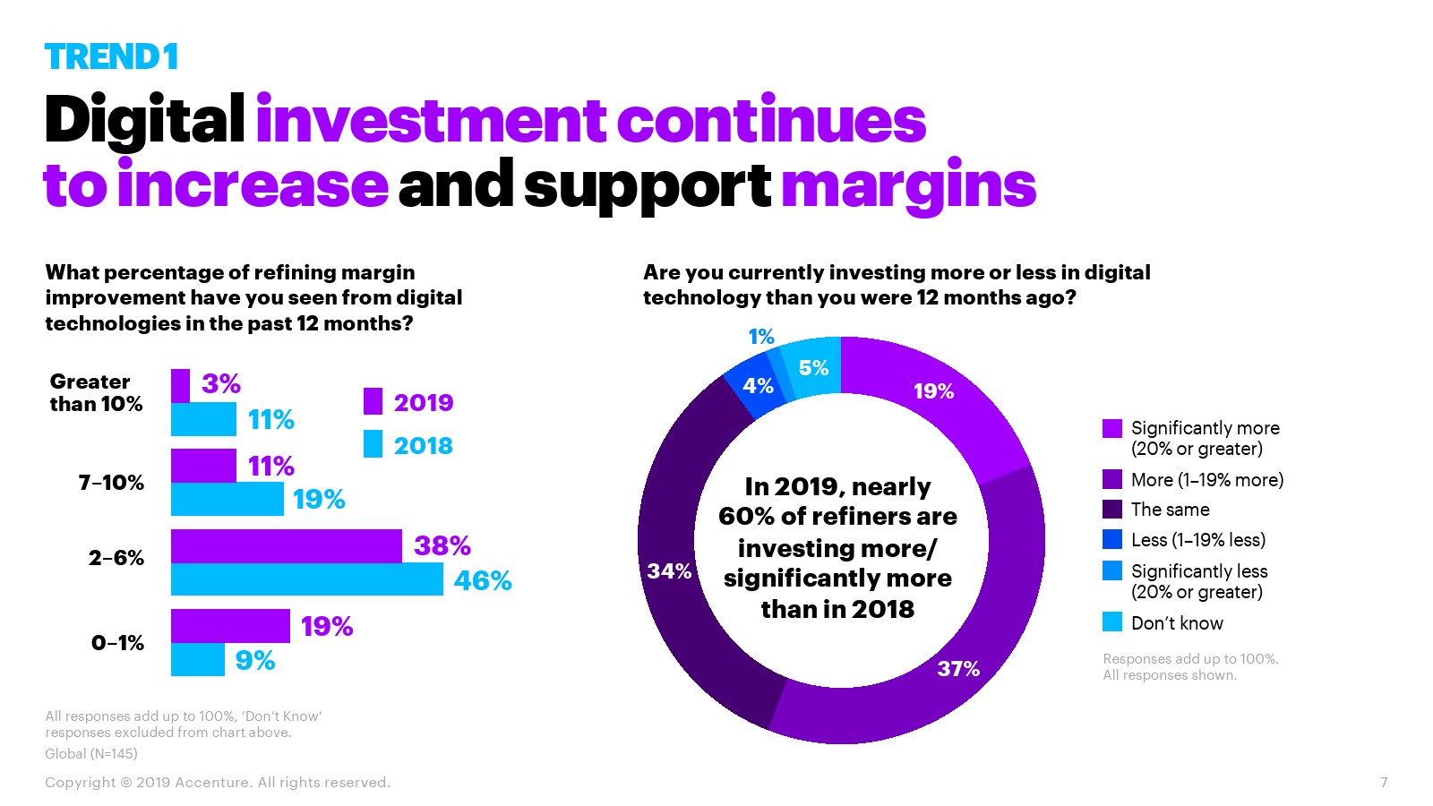 埃森哲发布了“2019年数字炼油报告”,揭示了数字技术对炼油行业的影响。在过去一年里,数字技术在炼油业务中实现10%以上的利润率改善的炼油厂数量从11%下降到3%;数字技术实现7%-10%利润率改善的炼油厂数量从19%下降到11%;数字技术实现利润率提高2%-6%的炼油厂数量从46%下降到38%。
