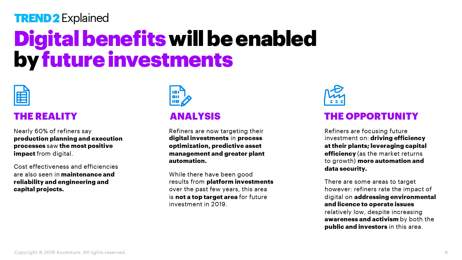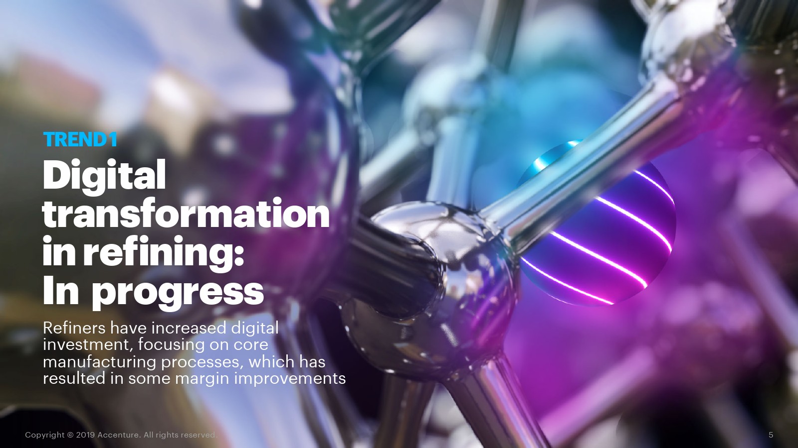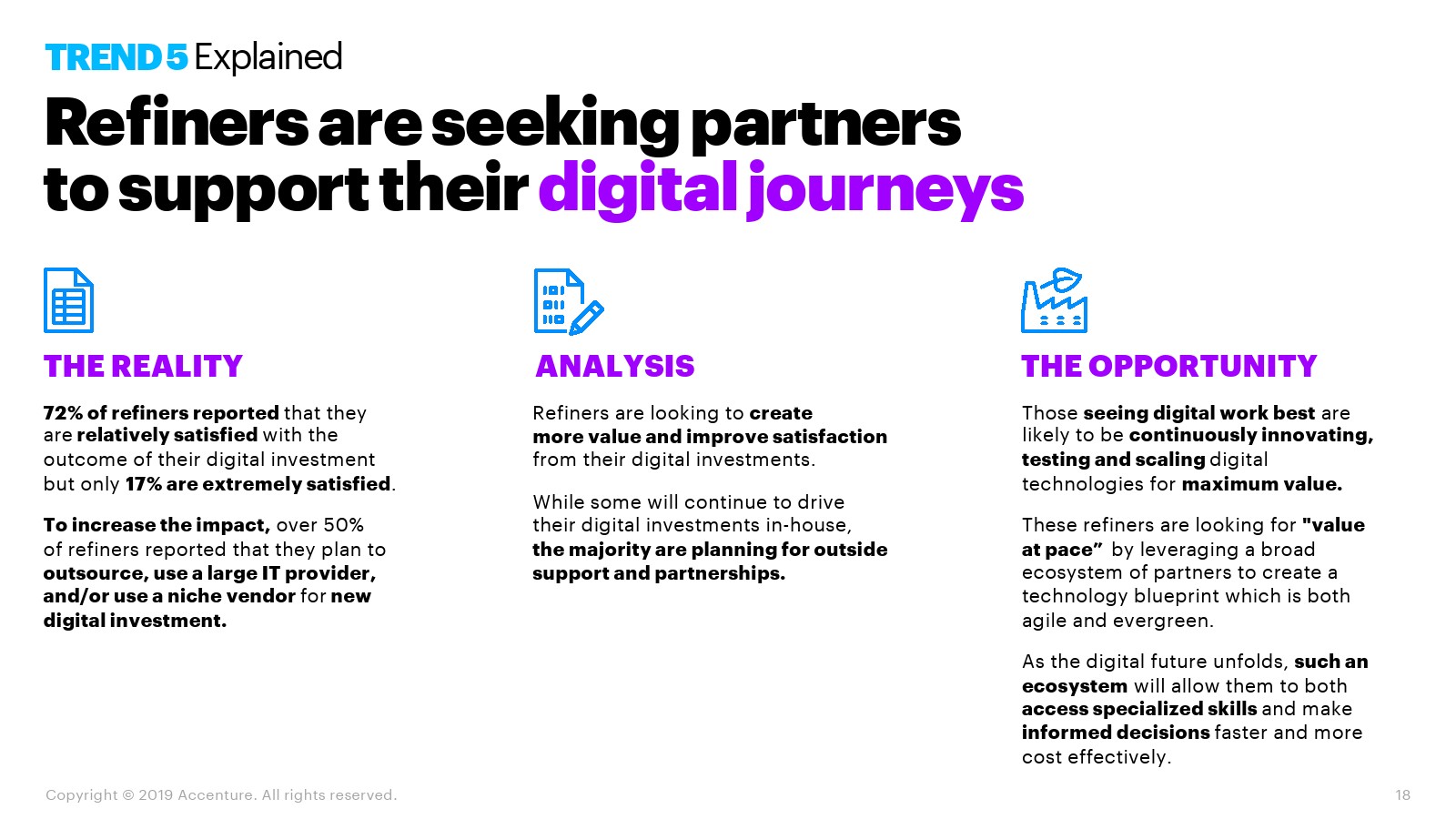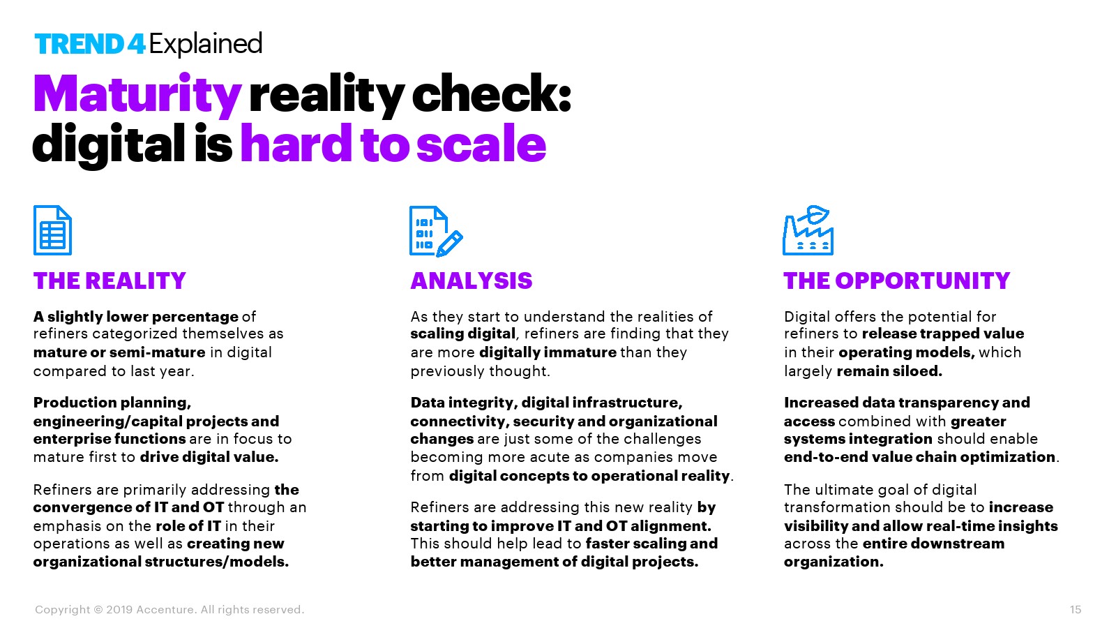 埃森哲发布了“2019年数字炼油报告”,揭示了数字技术对炼油行业的影响。在过去一年里,数字技术在炼油业务中实现10%以上的利润率改善的炼油厂数量从11%下降到3%;数字技术实现7%-10%利润率改善的炼油厂数量从19%下降到11%;数字技术实现利润率提高2%-6%的炼油厂数量从46%下降到38%。