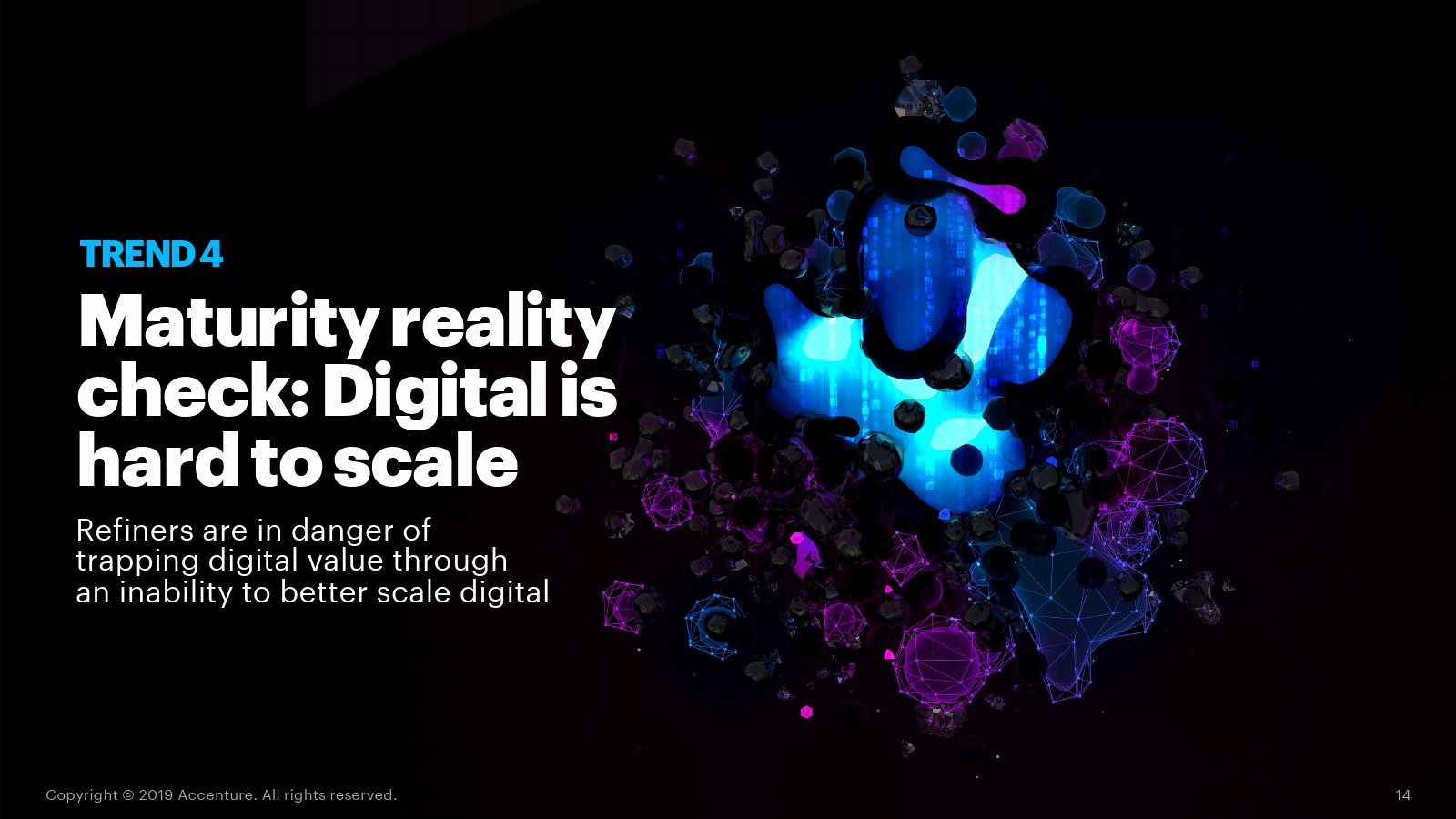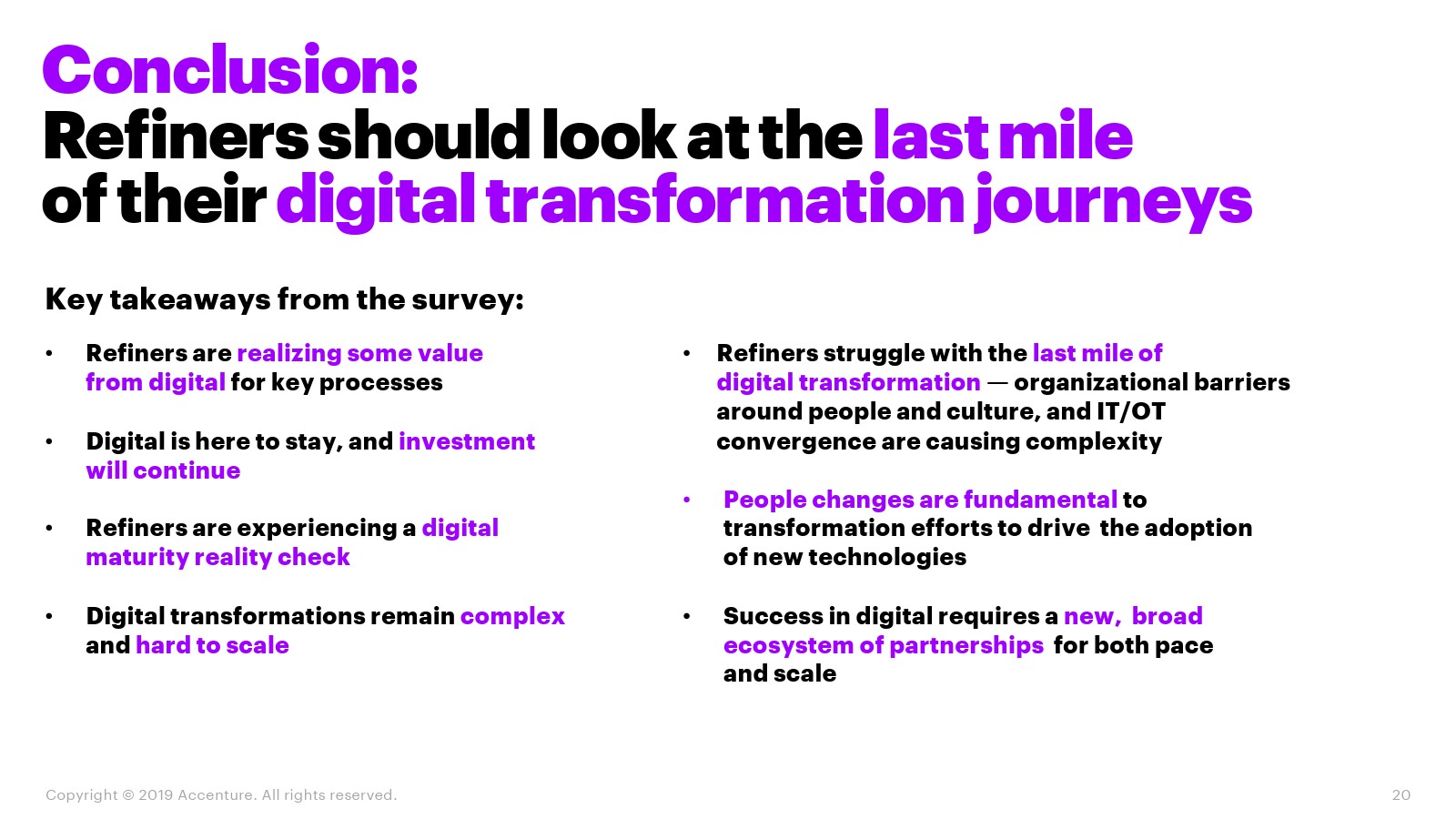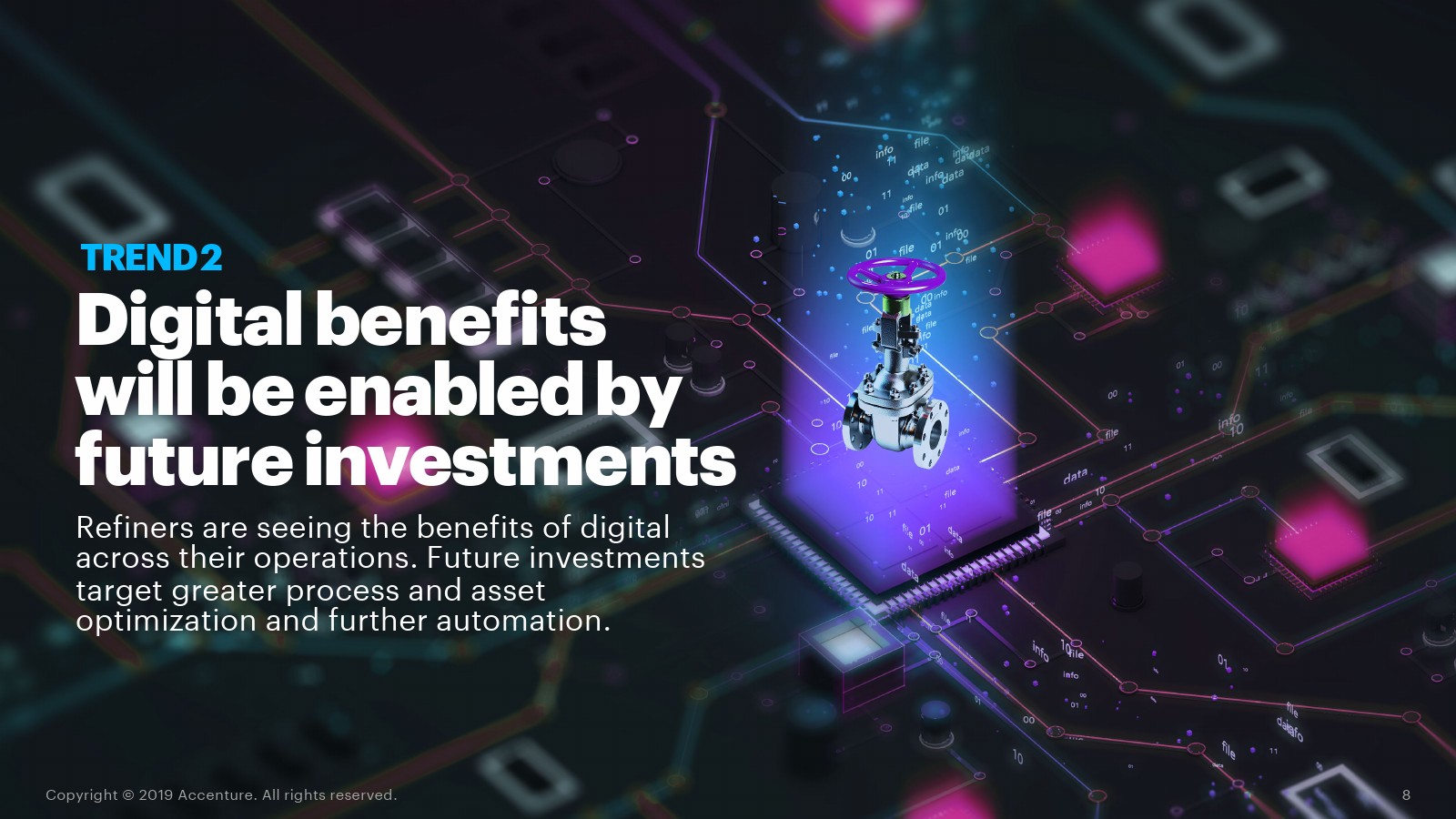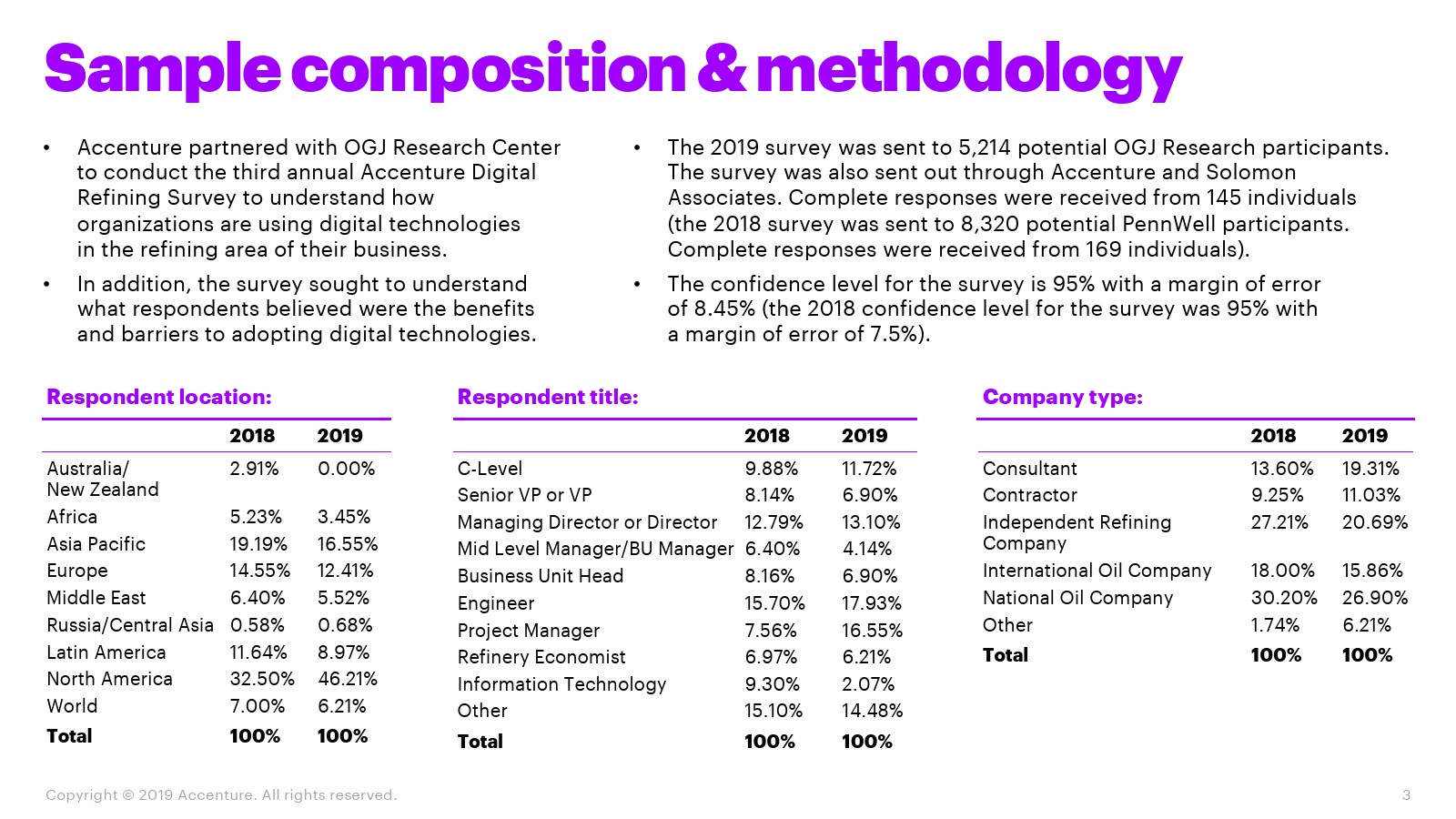 埃森哲发布了“2019年数字炼油报告”,揭示了数字技术对炼油行业的影响。在过去一年里,数字技术在炼油业务中实现10%以上的利润率改善的炼油厂数量从11%下降到3%;数字技术实现7%-10%利润率改善的炼油厂数量从19%下降到11%;数字技术实现利润率提高2%-6%的炼油厂数量从46%下降到38%。
