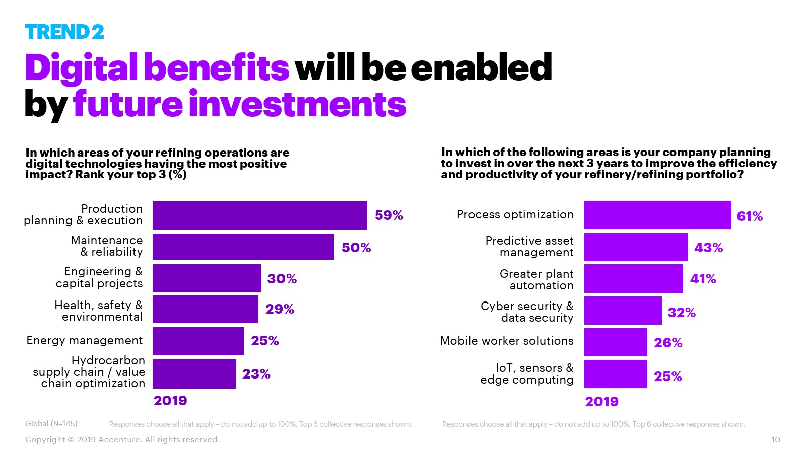 但是,数字支出继续速度增长。56%的受访者表示,与12个月前相比,他们在数字技术方面的投资更多或明显更多。当被问及数字技术对其运营的哪些领域产生了最积极的影响时,提到生产计划和执行(59%)的受访者最多,其次是维护和可靠性(50%)以及工程和资本(30%)。