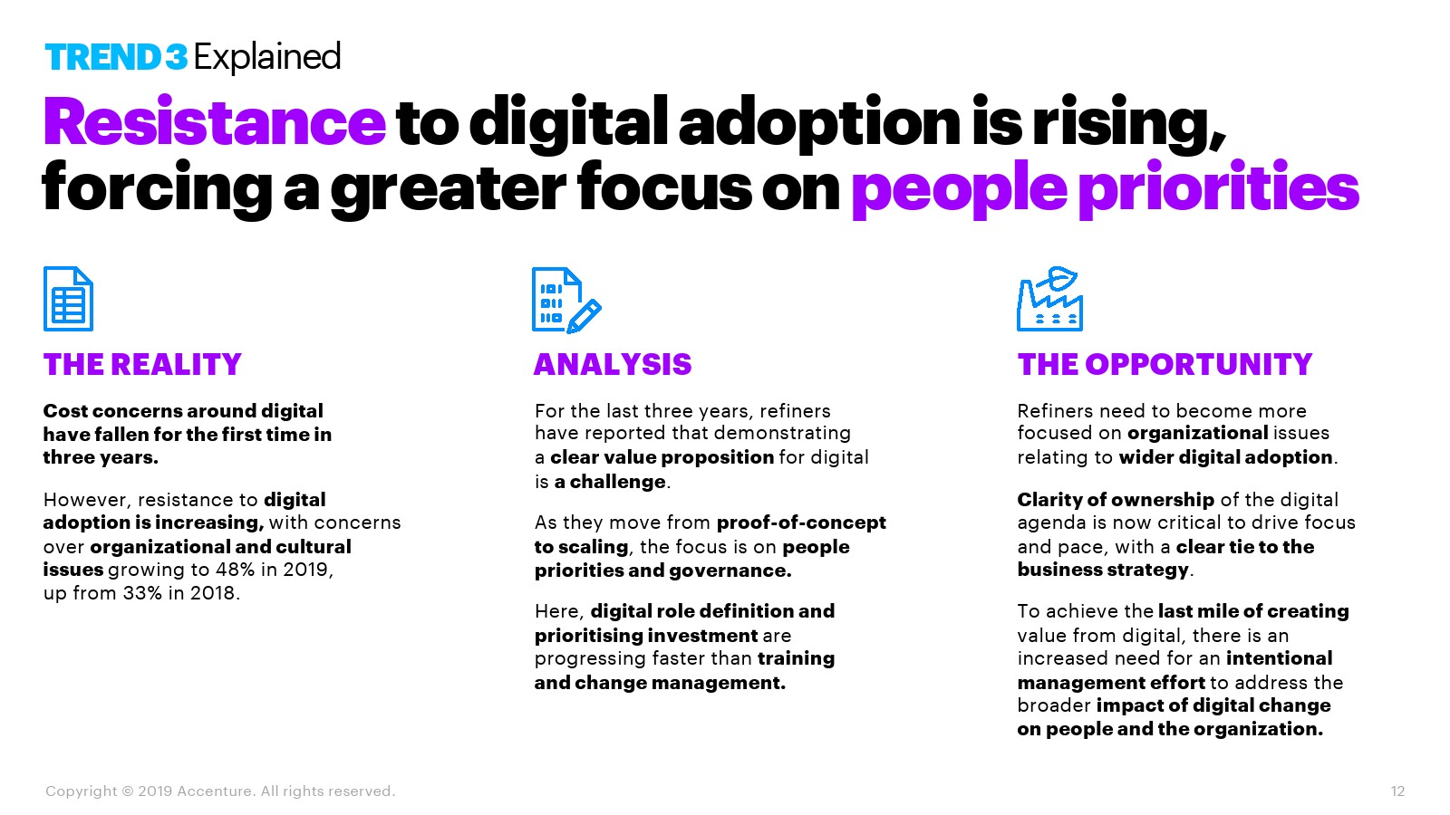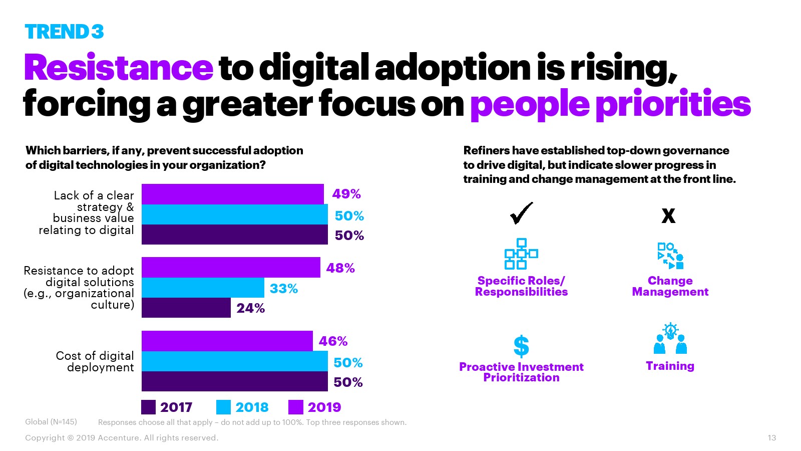 报告指出,与大多数转型项目一样,人是成功的基石。但是,来自员工和企业文化的阻力仍然在阻碍炼油厂更广泛地部署数字技术,从去年的33%急剧上升至今年的48%。