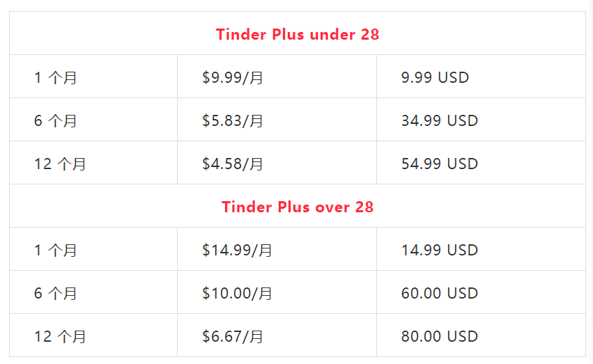 Tinder 在定价方面也是下足了功夫,特别是运用价格歧视。它以 28 岁作为了一个分水岭,它的每个订阅项对 28 岁以下和 28 岁以上都做了不同的定价策略。我们来看下表格: