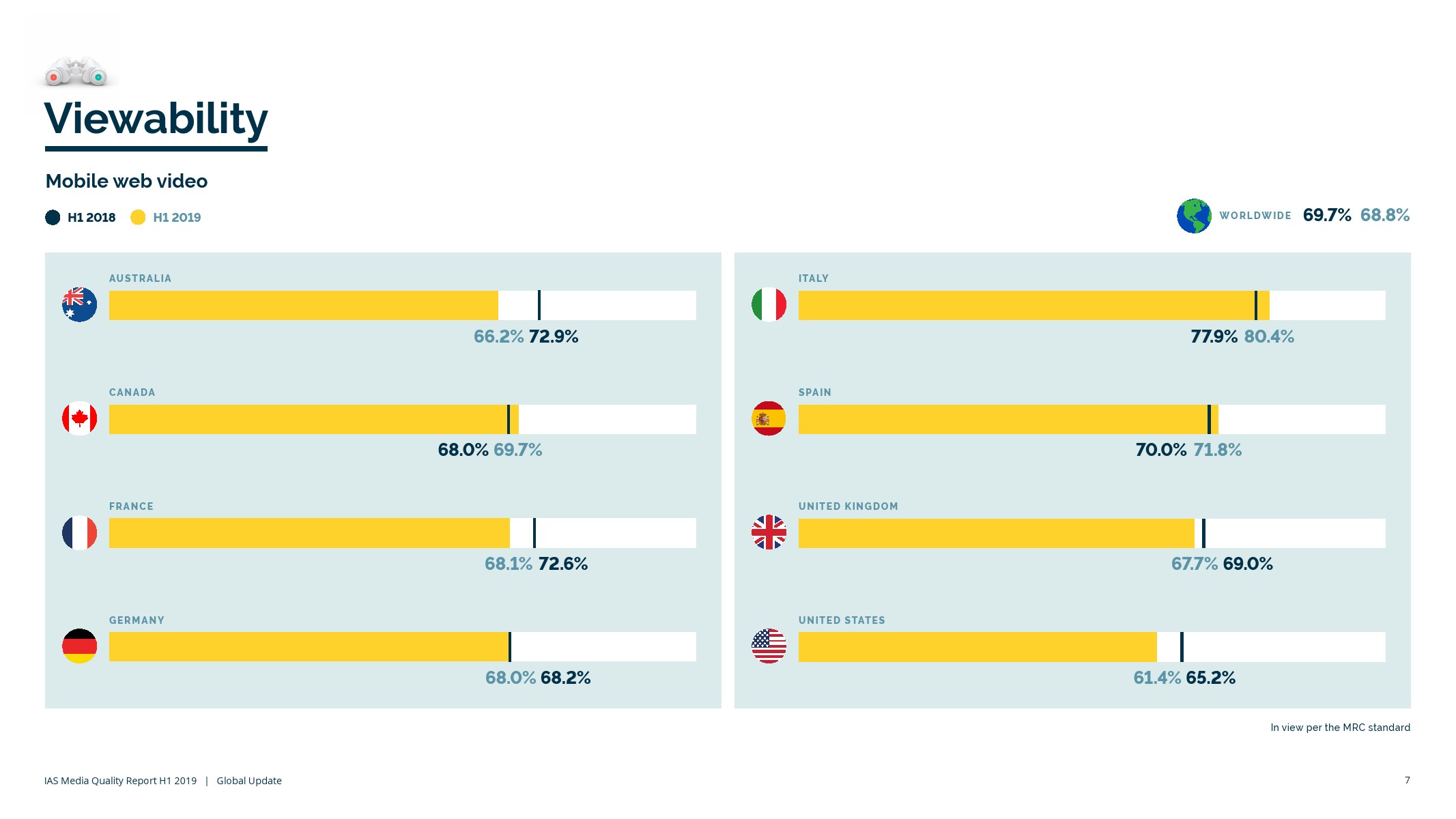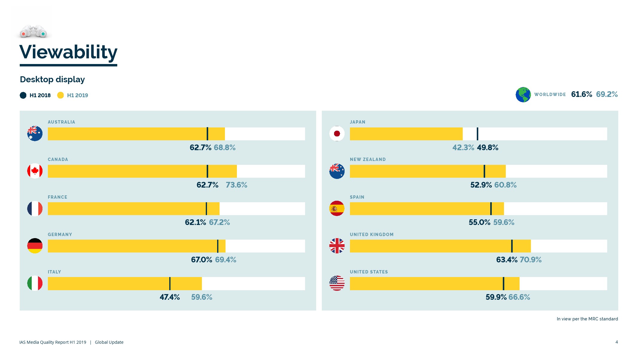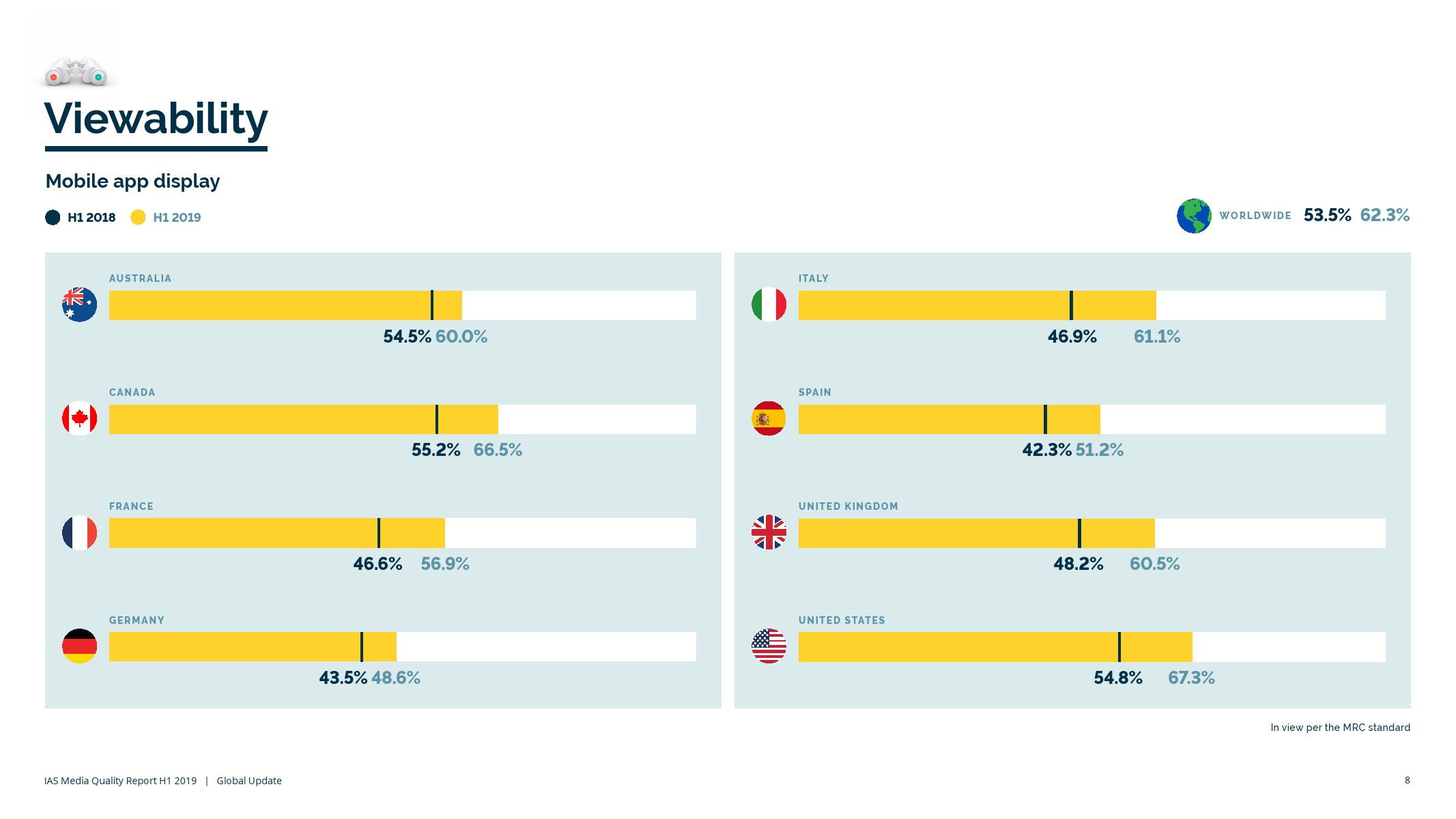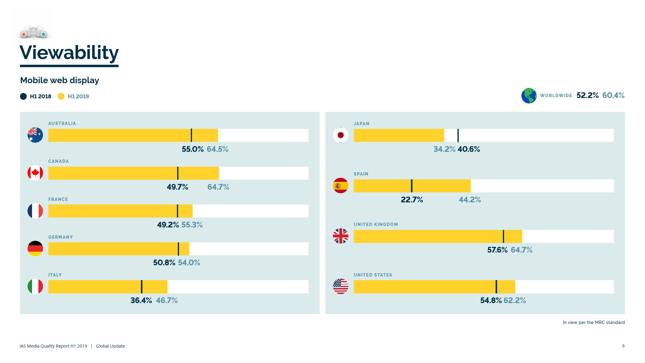 根据IAS的最新数据,2019年上半年全球广告平均可视性超过60%.