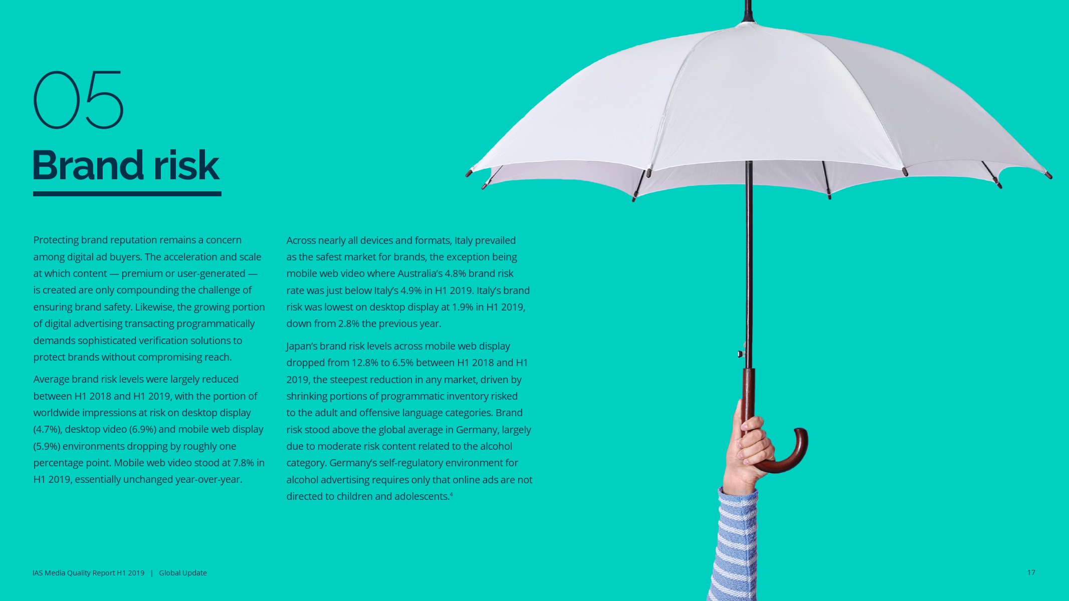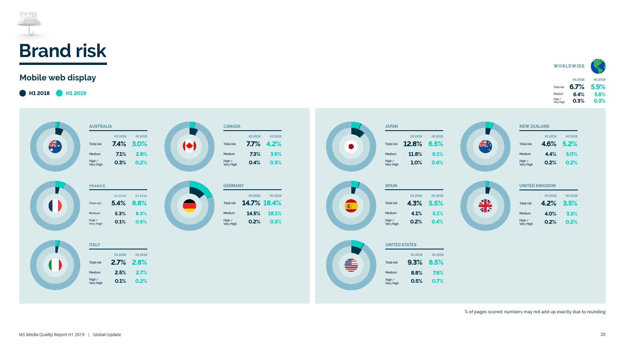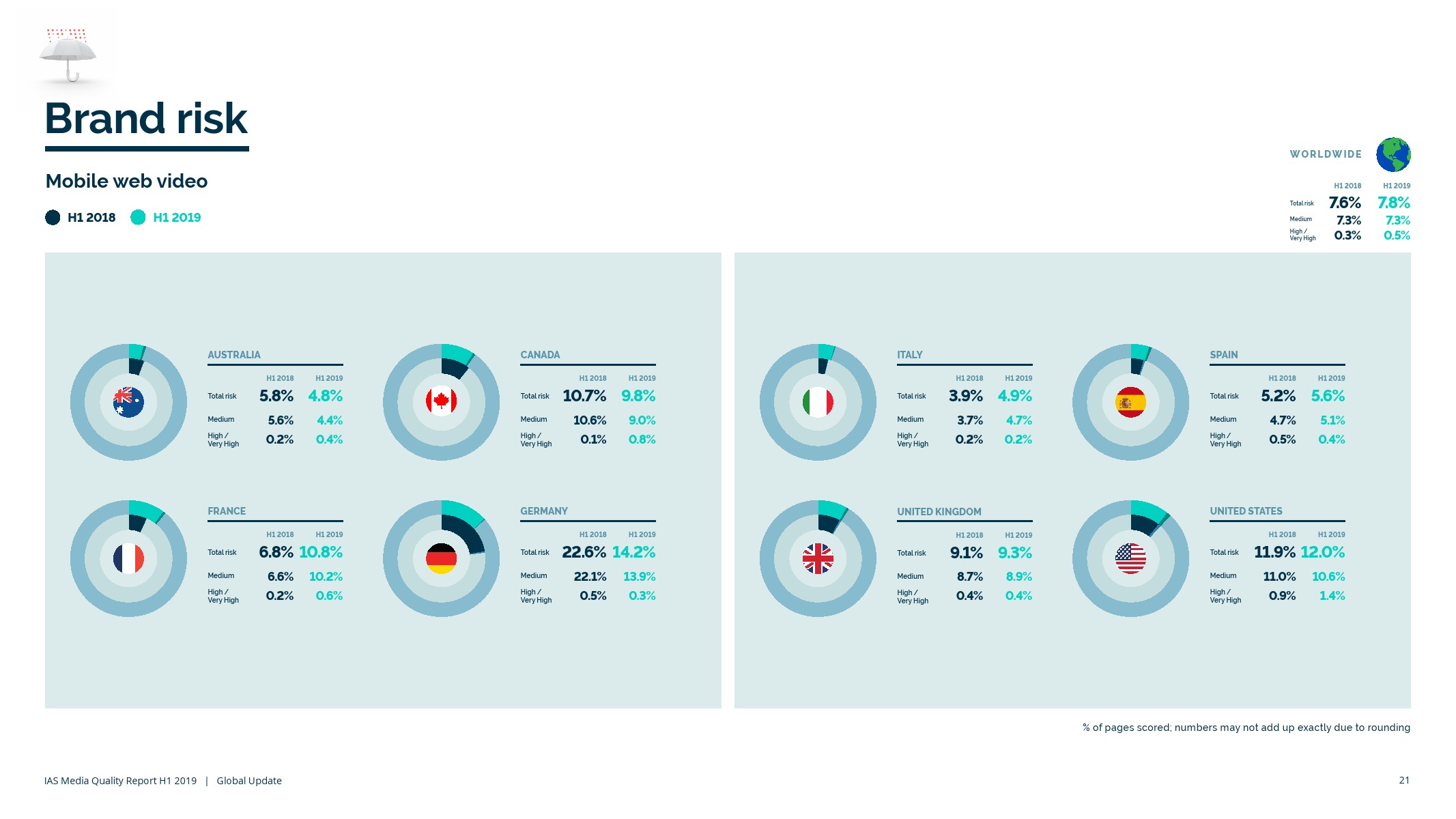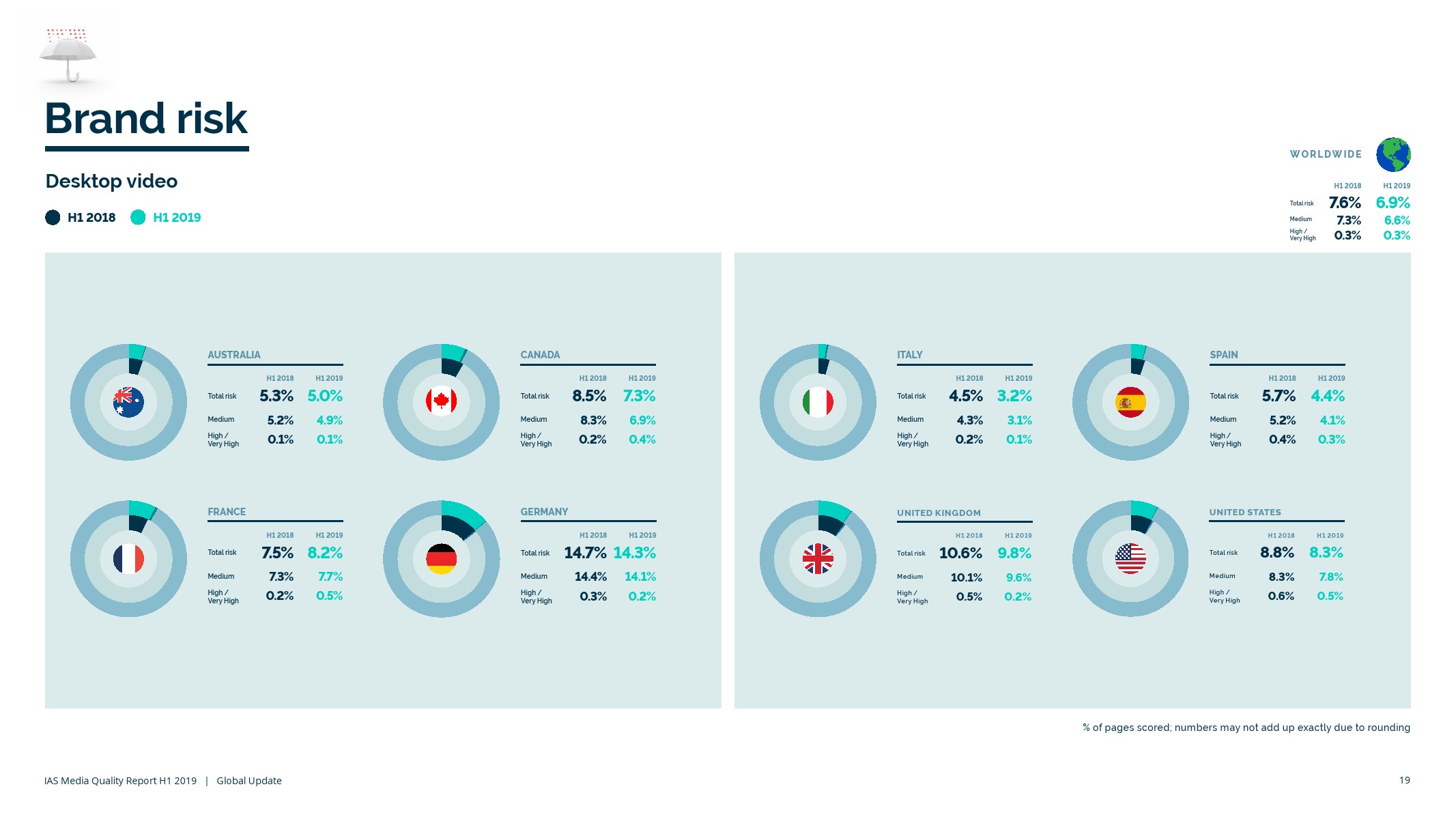 2018年上半年至2019年上半年,平均品牌风险水平大幅降低,PC展示广告(4.7%)、PC视频(6.9%)和移动网络展示广告(5.9%)环境中的风险下降了约1%。移动网络视频在2019年上半年保持在7.8%,基本上与去年同期持平。