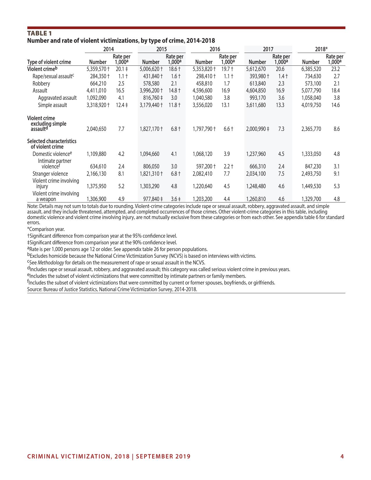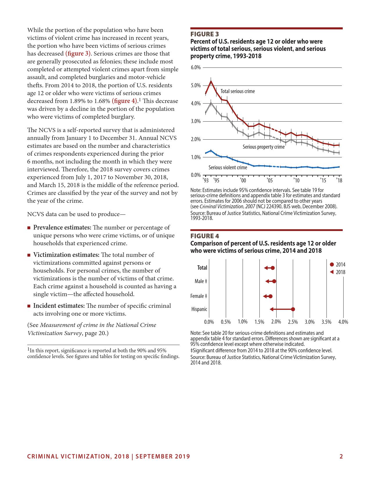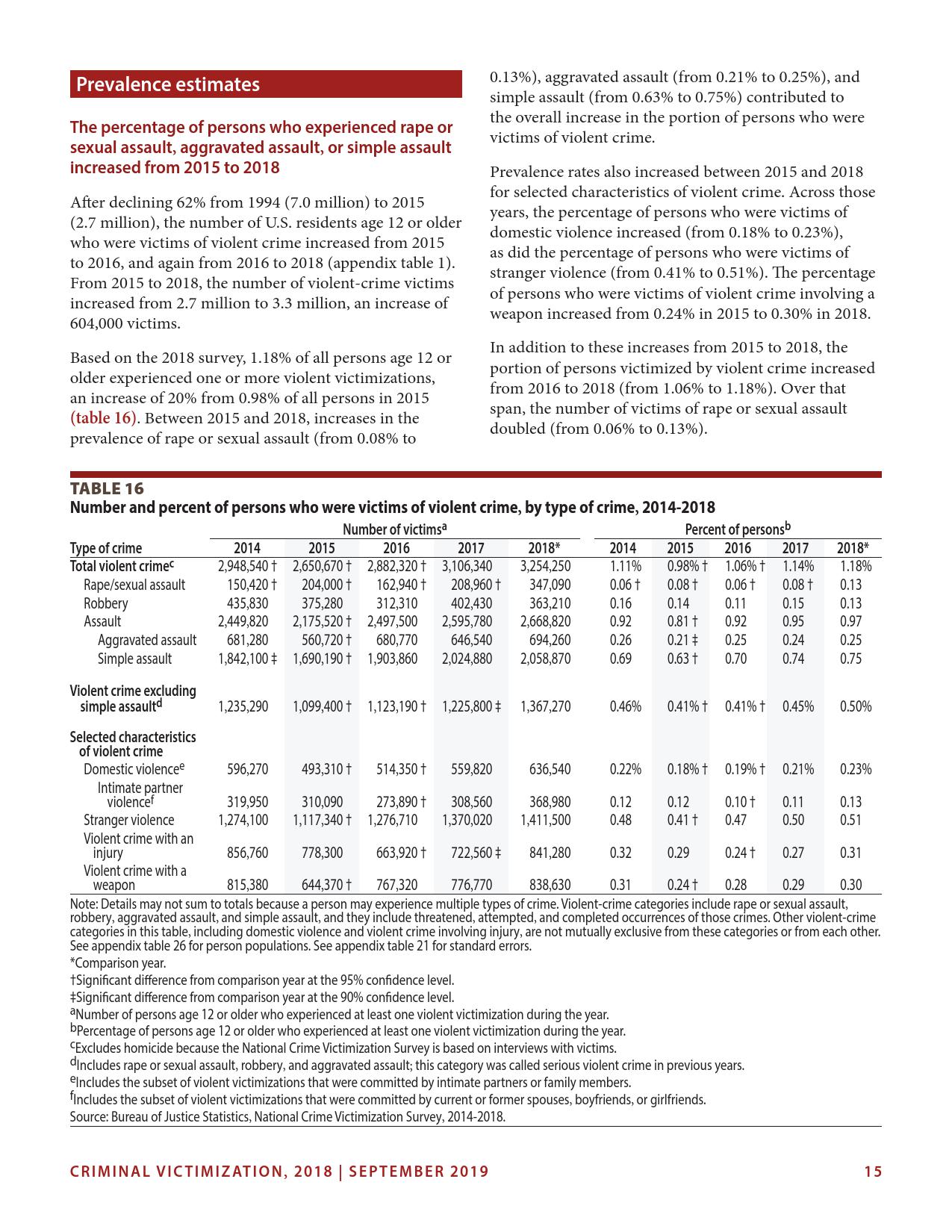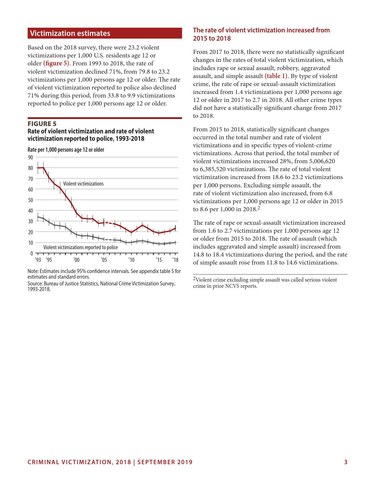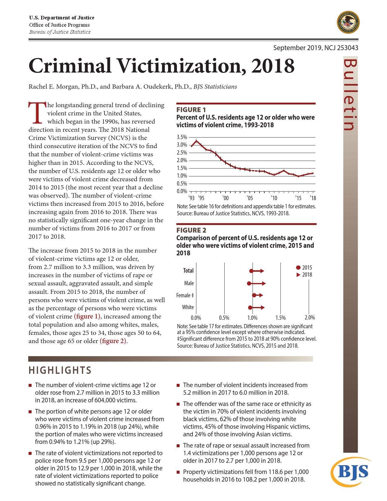 美国司法统计局(Bureau of Justice Statistics)的《全国犯罪受害调查报告》显示,2018年暴力犯罪受害人数为330万,高于2015年的270万。这项年度调查是由美国人口普查局(U.S. Census Bureau)进行的。