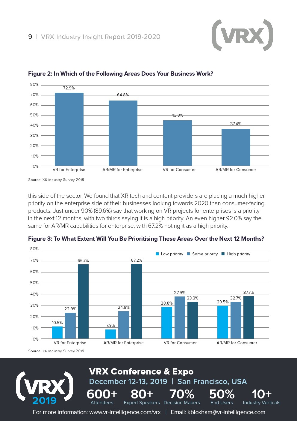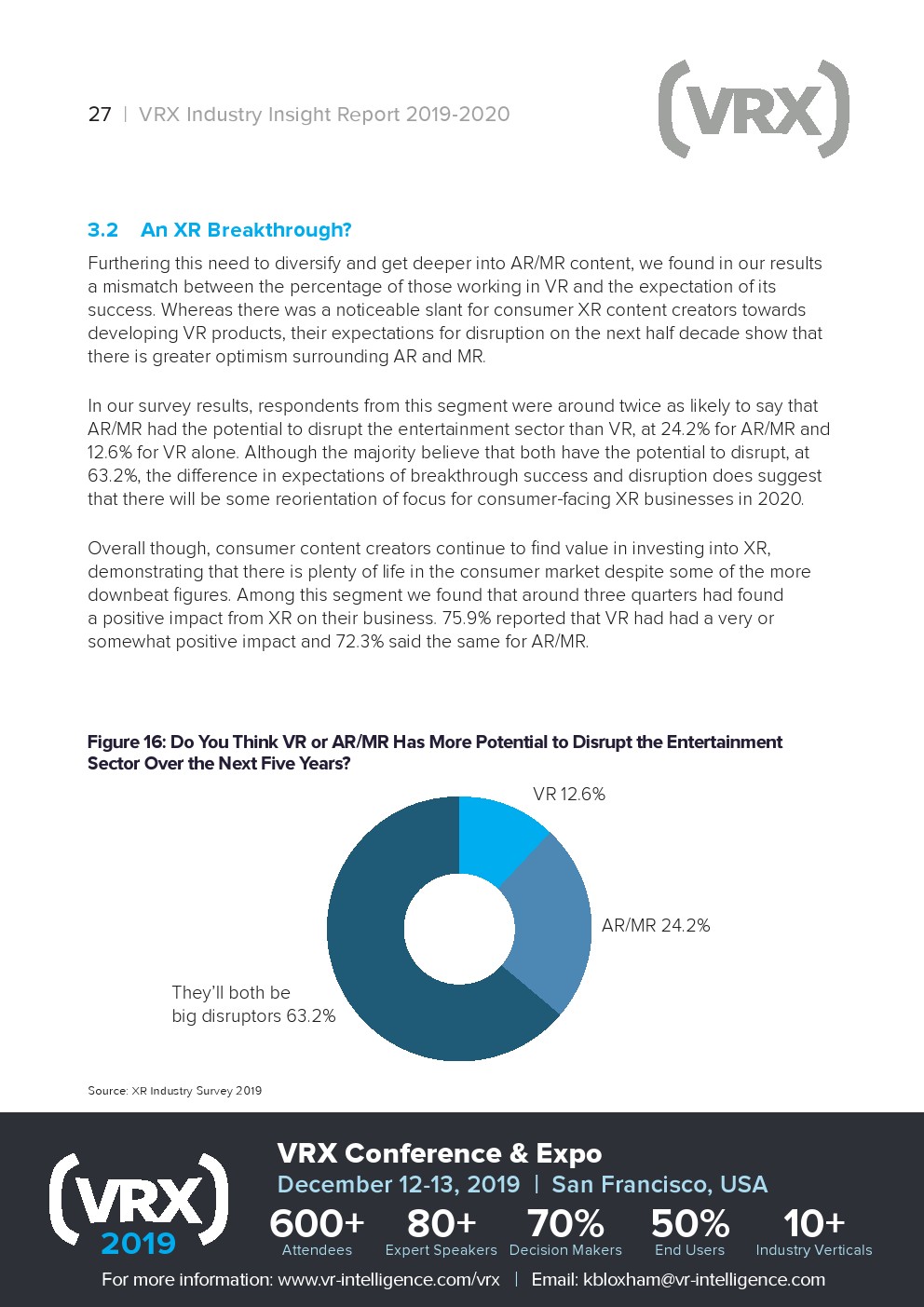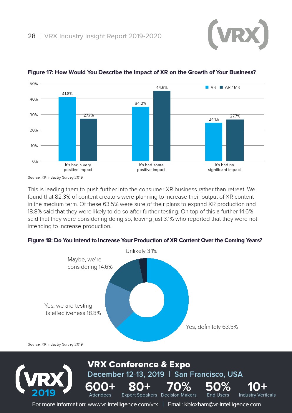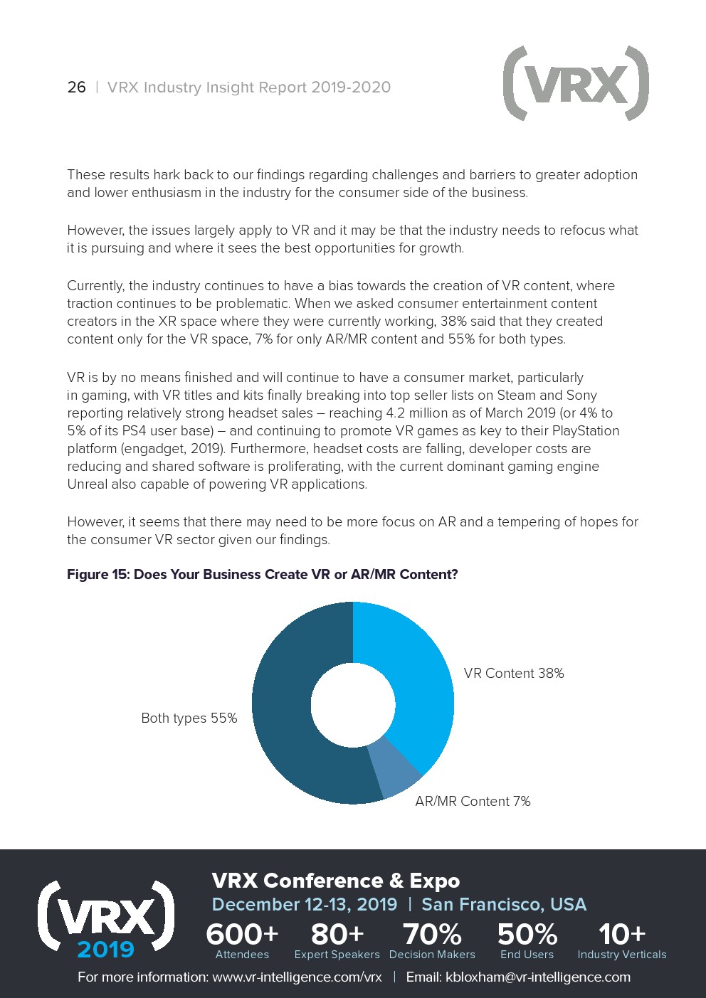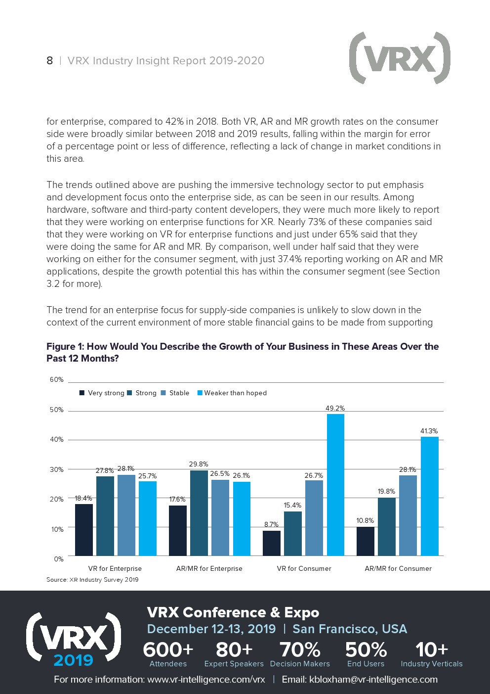 Alex Hadwick发布了“2019-2020 XR产业报告”。过去12个月,企业级XR硬件、软件和第三方内容创作增长远远高于消费者市场。只有25.7%的受访者表示,企业级VR增长比预期的要弱,对消费者市场有同样看法的占49.2%。